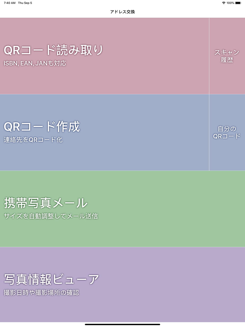 「アドレス交換」は、QRコードの読み取り、携帯のアドレス交換、写真交換をスムーズに行うためのアプリです。