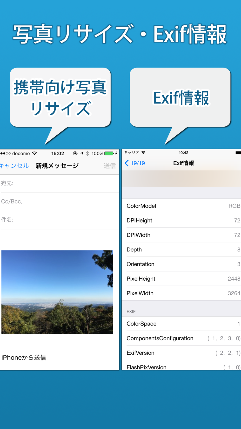 - 他の携帯で開けるサイズに自動的にリサイズして、写真を送信する機能。