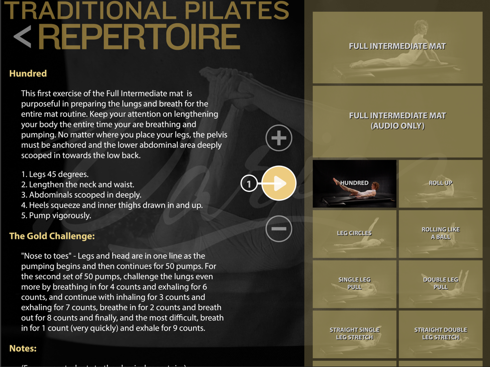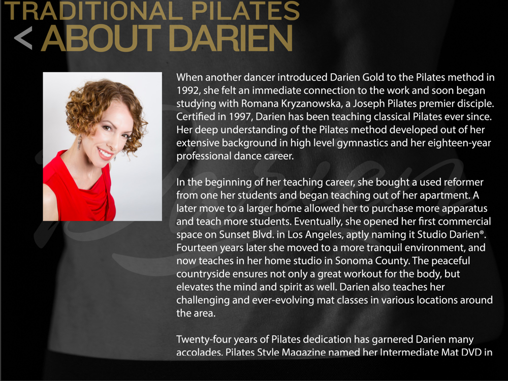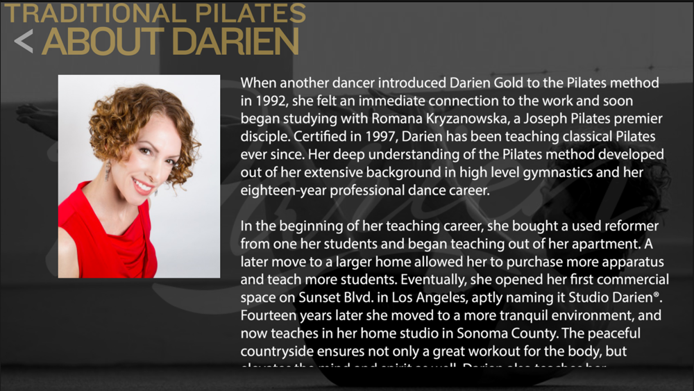 Make this app, the Studio Darien Pilates Intermediate app, your Pilates guide to learning the proper techniques and positions of classical Pilates. You’ll gain the vocabulary, terminology and cueing used by most classical Pilates instructors. If you already are a practitioner, this app will keep you on the Pilates track when you travel. If you attend class regularly, you can add variety and duration to your repertoire by combining the mat exercises with the Rowing and Teaser series and an original Magic circle routine with its emphasis on the arms, legs, abdominals and gluteal muscles. You may amaze yourself as you see how much less effort it takes for you move throughout your day.