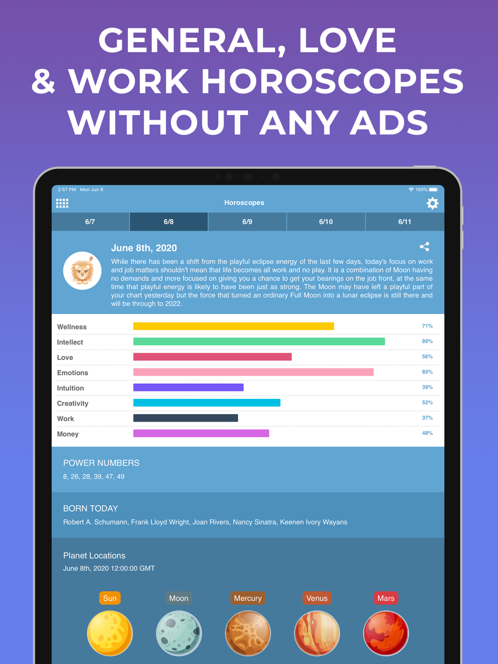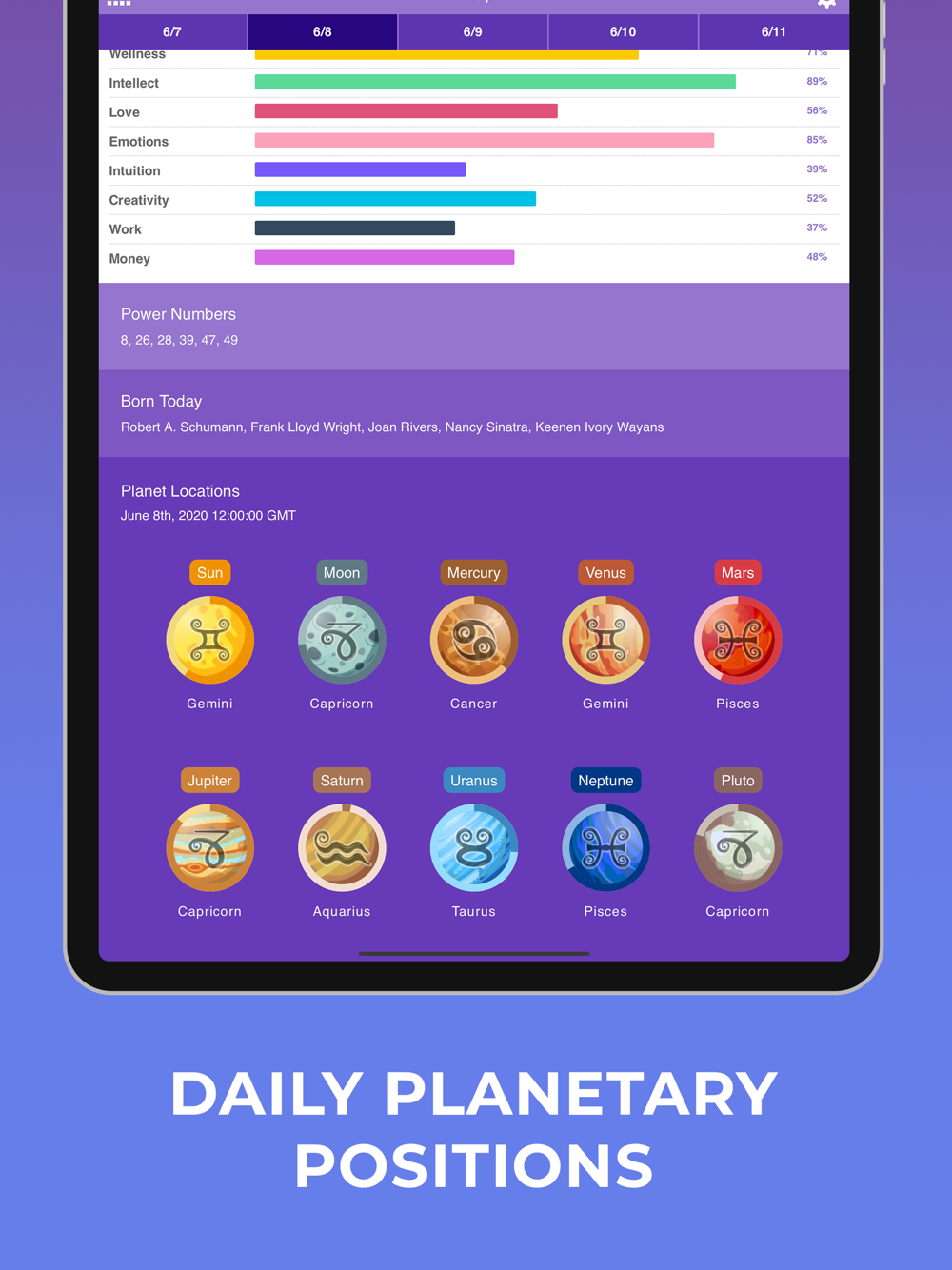 - daily predictions for: wellness, intellect, love, emotions, intuition, creativity, work & money