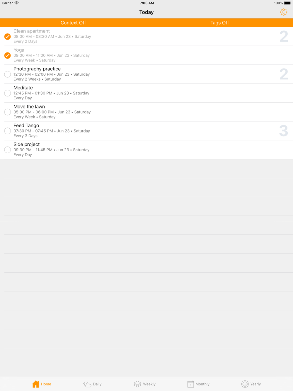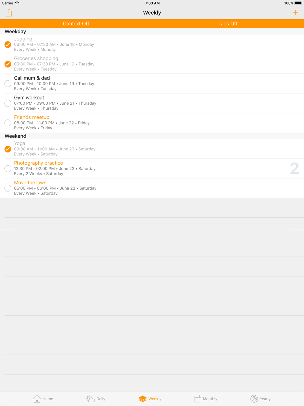 - For each daily/weekly/monthly/yearly list, tap the list title to toggle different views. Views are different grouping and sorting of tasks.