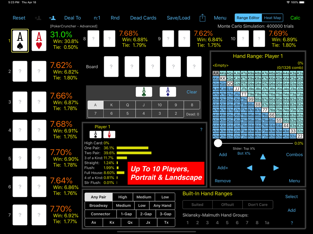 Poker is a game of incomplete information; we need to think in terms of *ranges of hands*. PokerCruncher surpasses the standard features, e.g. range equity breakdown heat maps and hand combo stats. Full grid of all 169 starting hands, top x% of hands slider, select hand combos (suits and weights) in hand ranges, extensive built-in hand ranges, save/load and export/import hand ranges, …