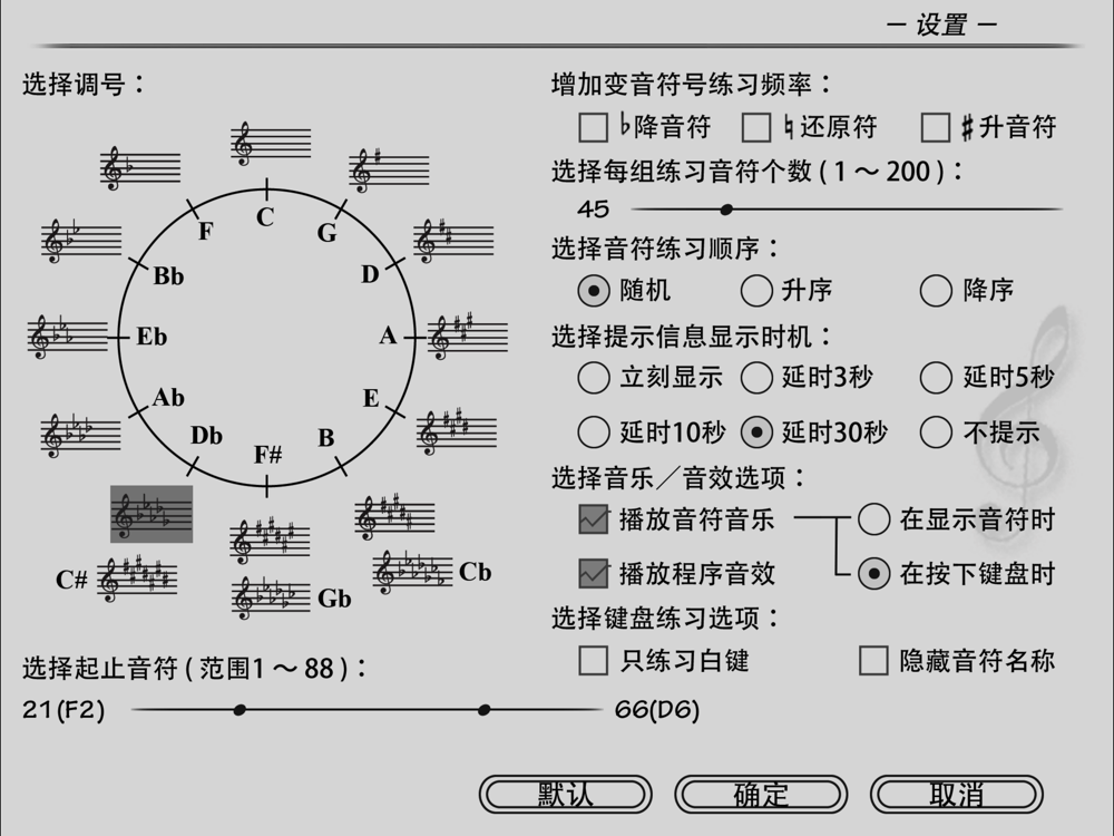 4、自定义练习选项以适应所有水平的使用者,包括可设置所有调号,增加/减少变音符号出现频率,选择音符练习范围,设置提示信息显示时机,只练习白键或者练习所有键等。您可以使用本应用程序作为练耳的工具,或者只是让它指引您完成学习过程;