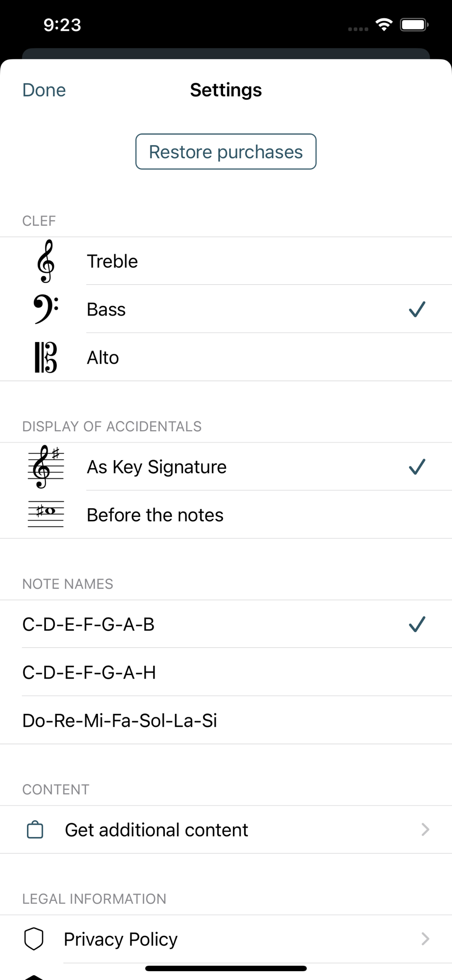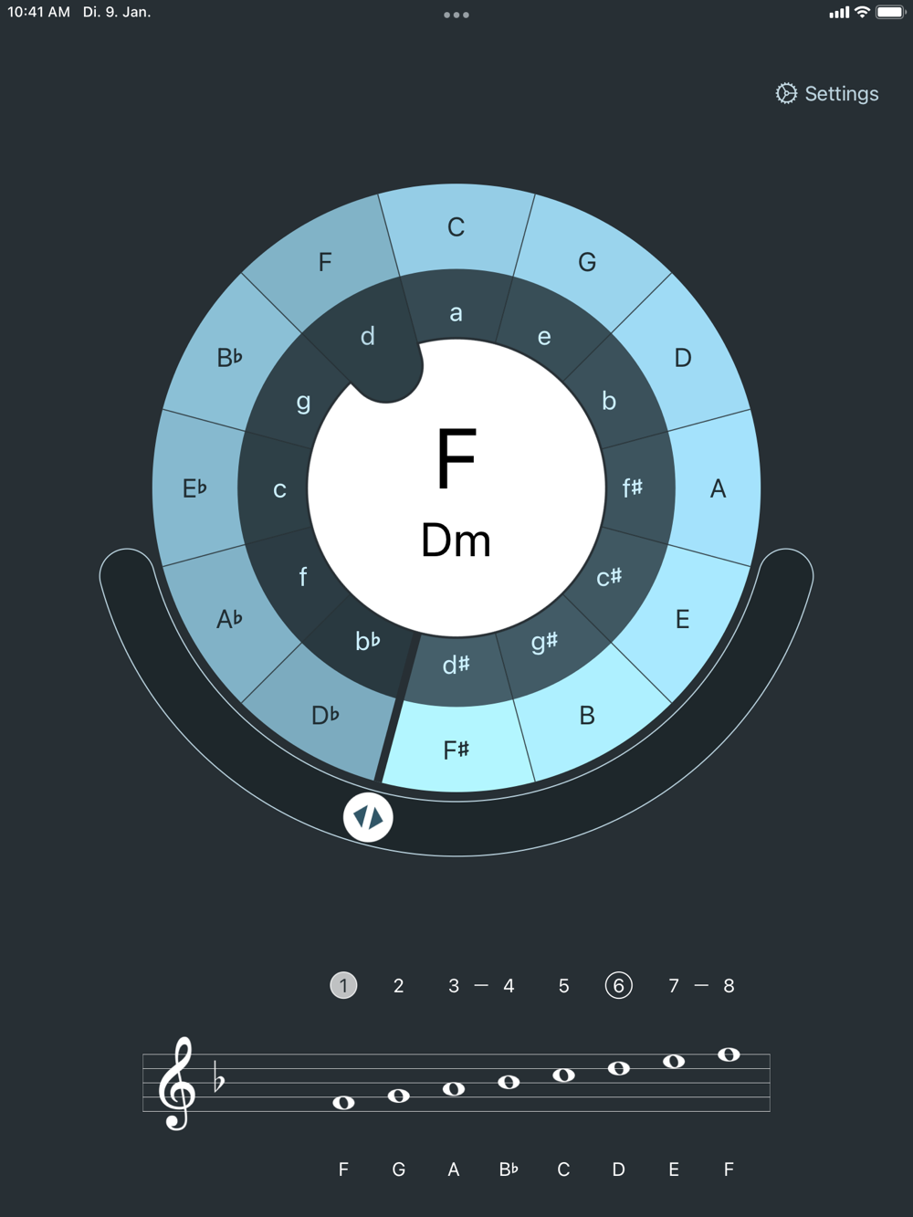 A key in the circle can be selected either by touching the tonic or by turning the slider in the middle. The circle displays both the respective major and parallel minor scales. The display ranges from F-flat major (D-flat minor) to G-sharp major (E-sharp minor). A second slider can be used to move the visible circle section accordingly.
