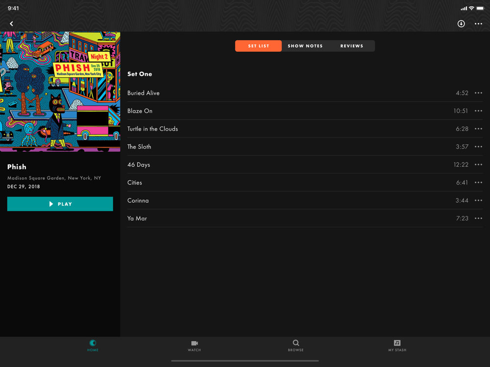 The official Phish iOS app features gapless playback, scrubbing forward and backwards within tracks, Twitter, Facebook and email sharing of your favorite songs and shows. LivePhish+ subscribers can save shows and playlists for offline playback, access the entire LivePhish catalog, including new shows during a tour and any newly added releases, watch archival video releases, and more!