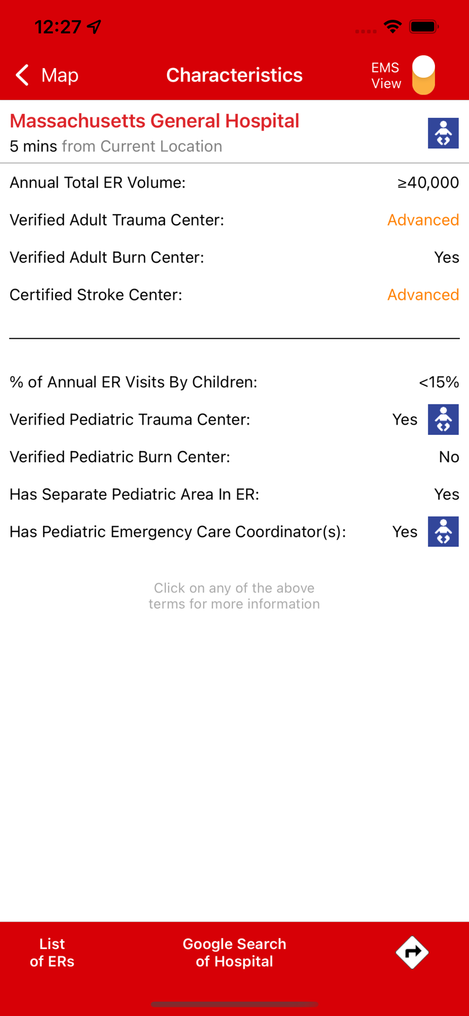 Once you select an ER, you have 1-click access to directions to the ER and additional information about annual ER visit volume and whether the hospital has a verified adult trauma, adult burn, or stroke center. Using the “EMS View” feature, you can also see whether an adult trauma or stroke center has advanced or basic capabilities. The “EMS View” feature is designed for Emergency Medical Services personnel, but it may be viewed by anyone interested in learning more about these capabilities. You also have the ability to search online for more information about the ER.