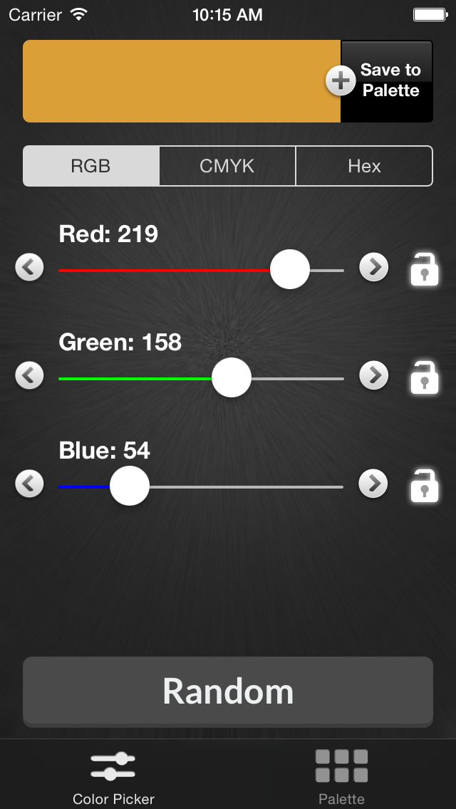 Build a color palette with unlimited hues using RGB, CMYK, or Hex values. Lock values to find complementary or analogous colors, move the sliders to pinpoint exact color values, or create a random color.