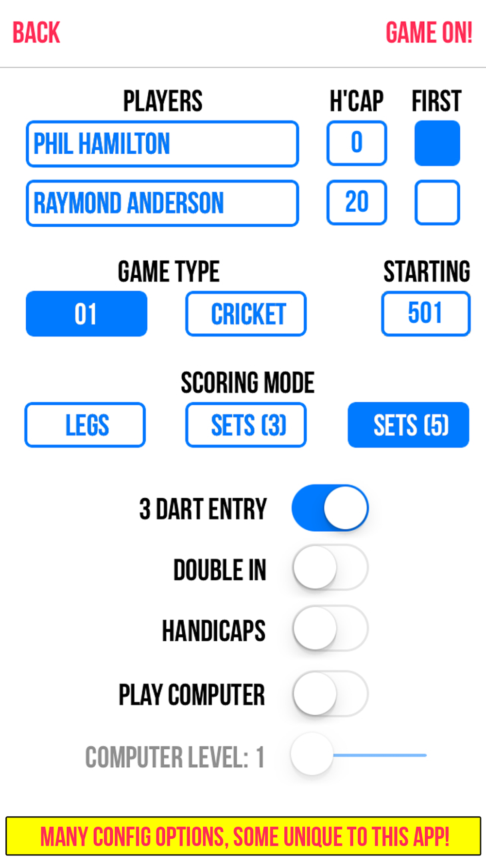 - Play with leg or set scoring (3 or 5 leg sets).