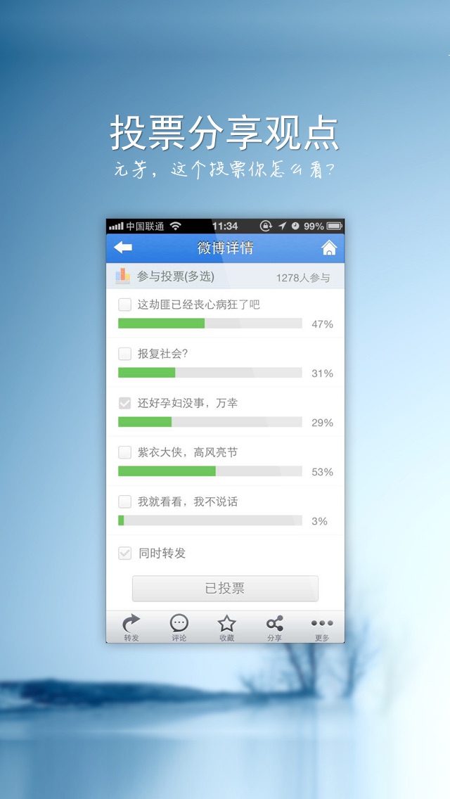 - 投一投票,呐喊一下。面对每天的趣闻、时事、观点,点一点投票,表达自己的意见,呼喊我们的声音。