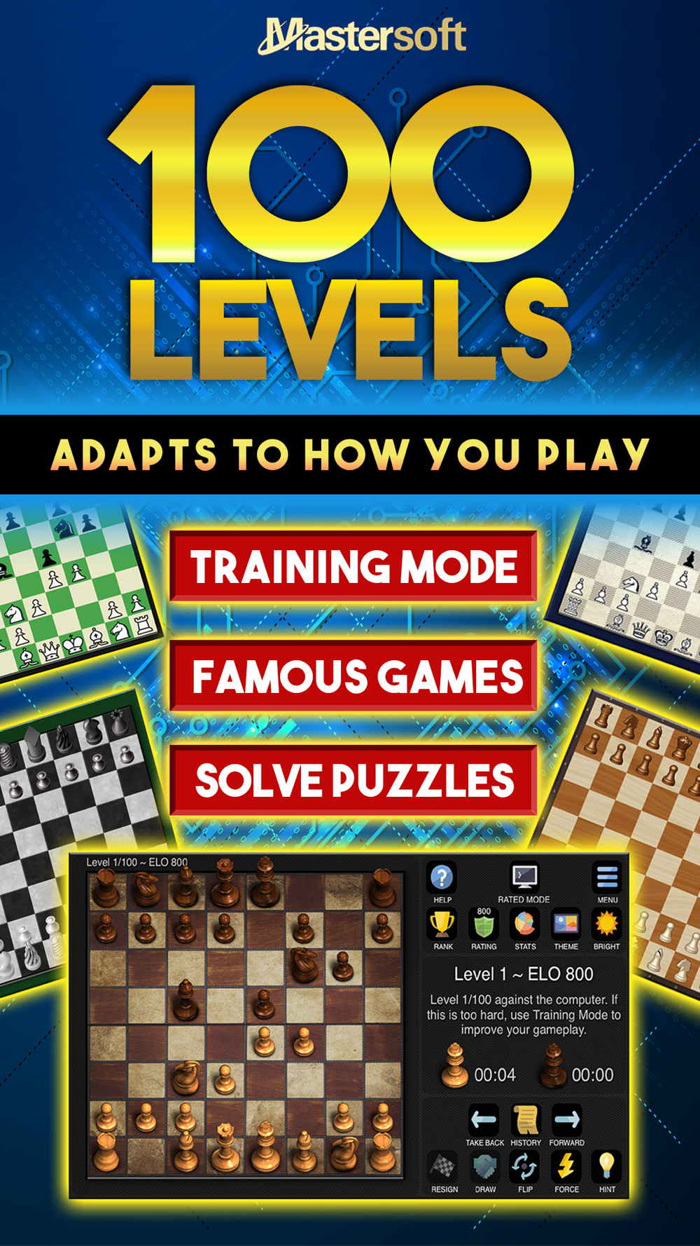 Mastersoft Chess will help you become a better chess player. It features a unique award winning chess engine that plays like a human at 100 levels. This continually rates your game play, adapts to it, and calculates your ELO. Also features two player chess, chess puzzles, a famous chess games database, blitz chess, and a coach that highlights best moves. Minimal advertising. No account creation or login required. Play straight away!