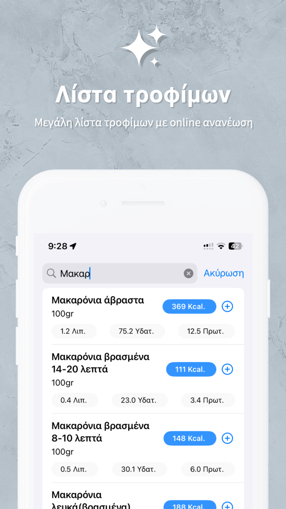 •Επιλογή τροφών από μία μεγάλη βάση τροφίμων και με συνεχή προσθήκη νέων, καθώς και ελεύθερη καταχώριση από τον χρήστη δικών του τροφών.