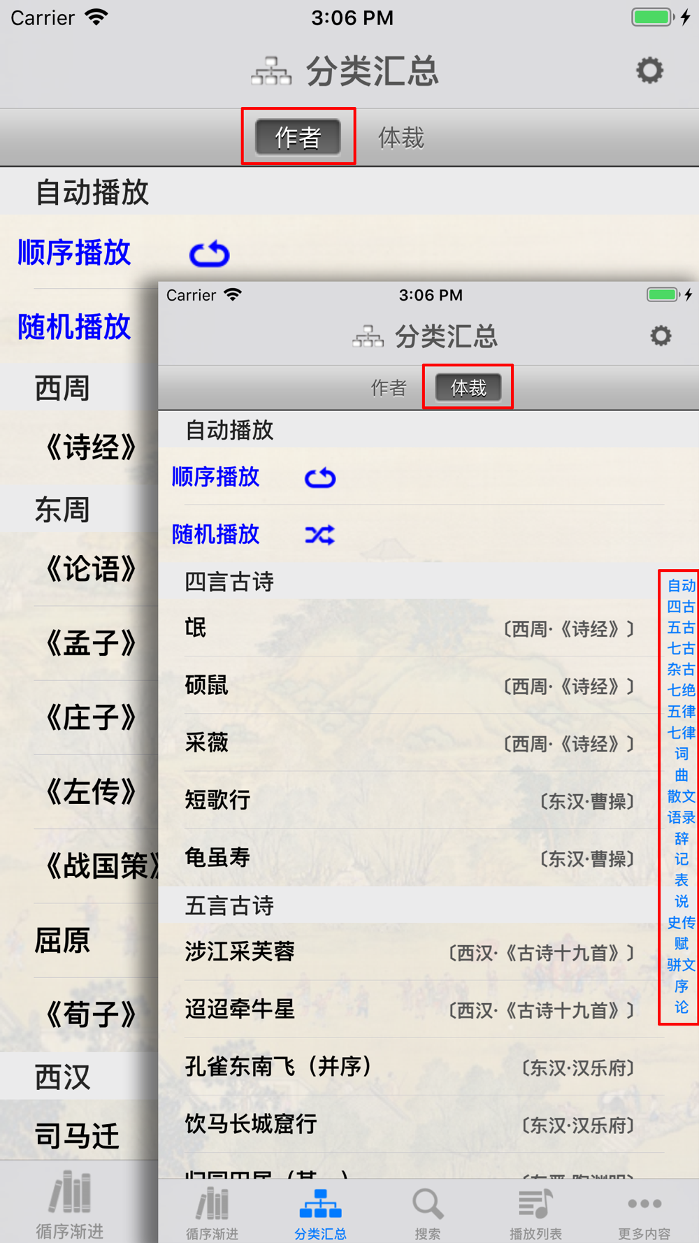 三、分类详细:本软件经过我们精心设计,将古典文学作品按照作者所处朝代进行了仔细划分,涵盖了西周、东周、秦、汉、三国、西晋、东晋、南北朝、唐、五代十国、北宋、南宋、金、元、明、清、民国等二十余个朝代、三千多年的历史跨度;同时又将古典文学作品按照体裁进行了仔细归类,包括了四言古诗、五言古诗、七言古诗、杂言古诗、五言绝句、七言绝句、五言律诗、七言律诗、词、曲、语录、辞、记、表、说、铭、史传、赋、骈文、序、论等二十余种文学体裁,非常方便您的阅读。