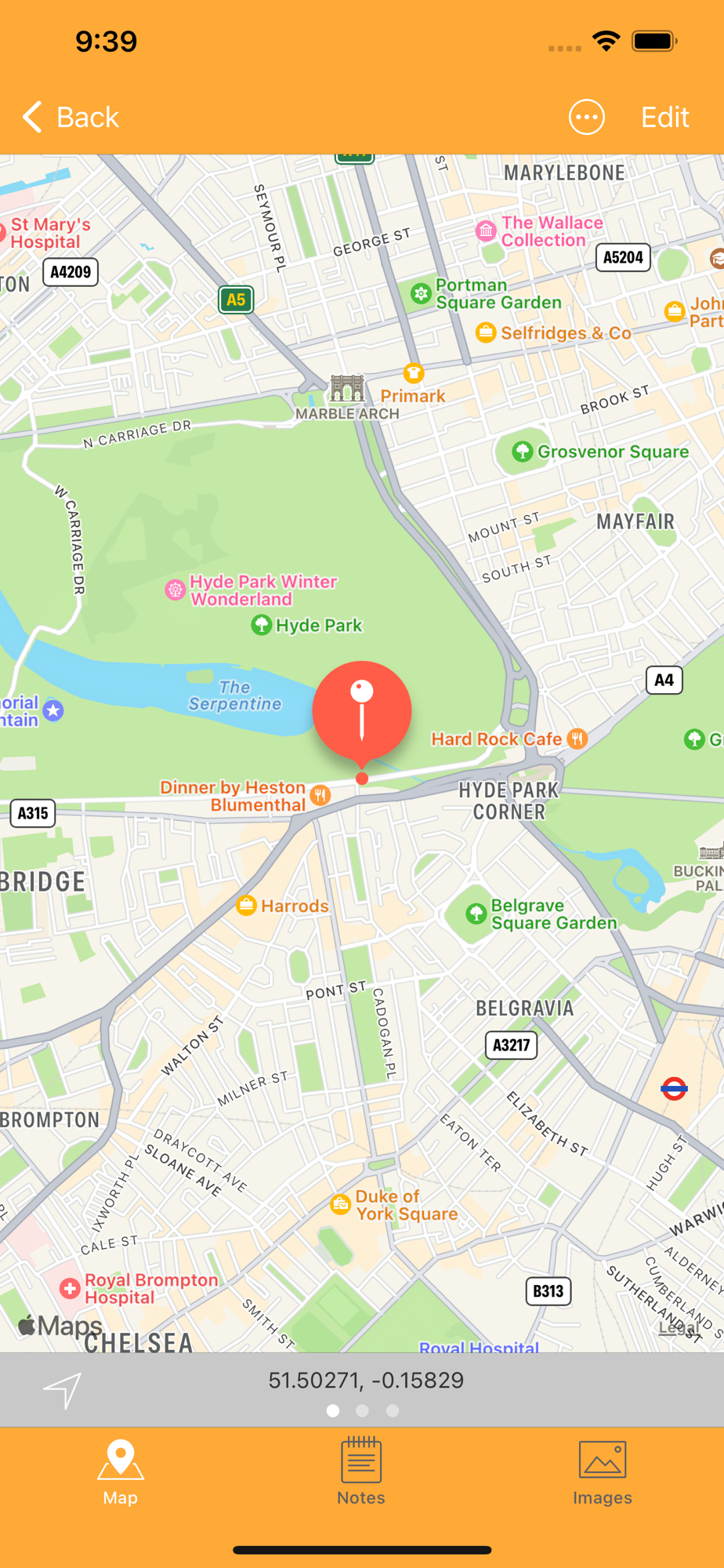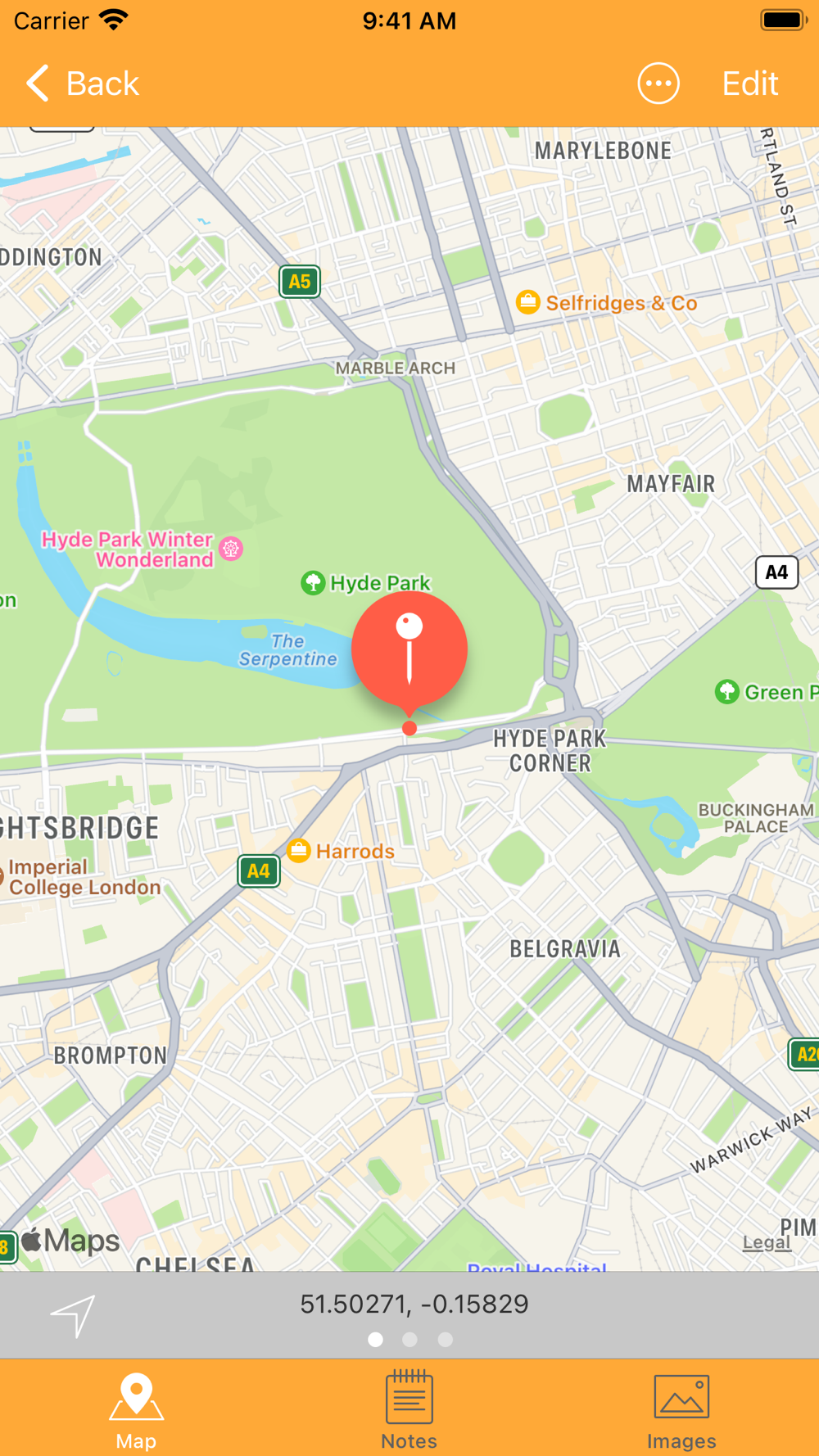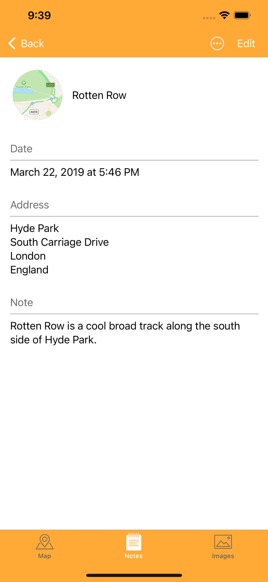 Assign a title to your places, include text notes and images that you can choose from your camera roll or take directly with the device camera.