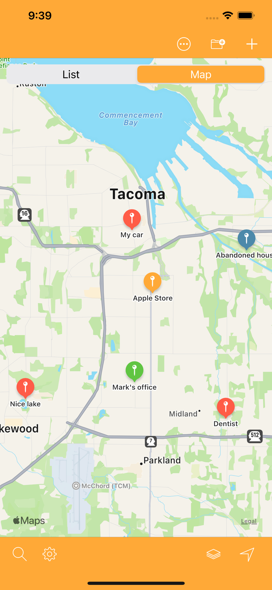 Choose whether to show your places on a map or a list. The list is customizable and allows you to choose which information to display. The map instead allows you to compare the places with your current position.