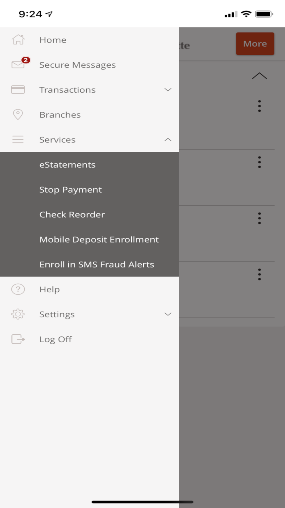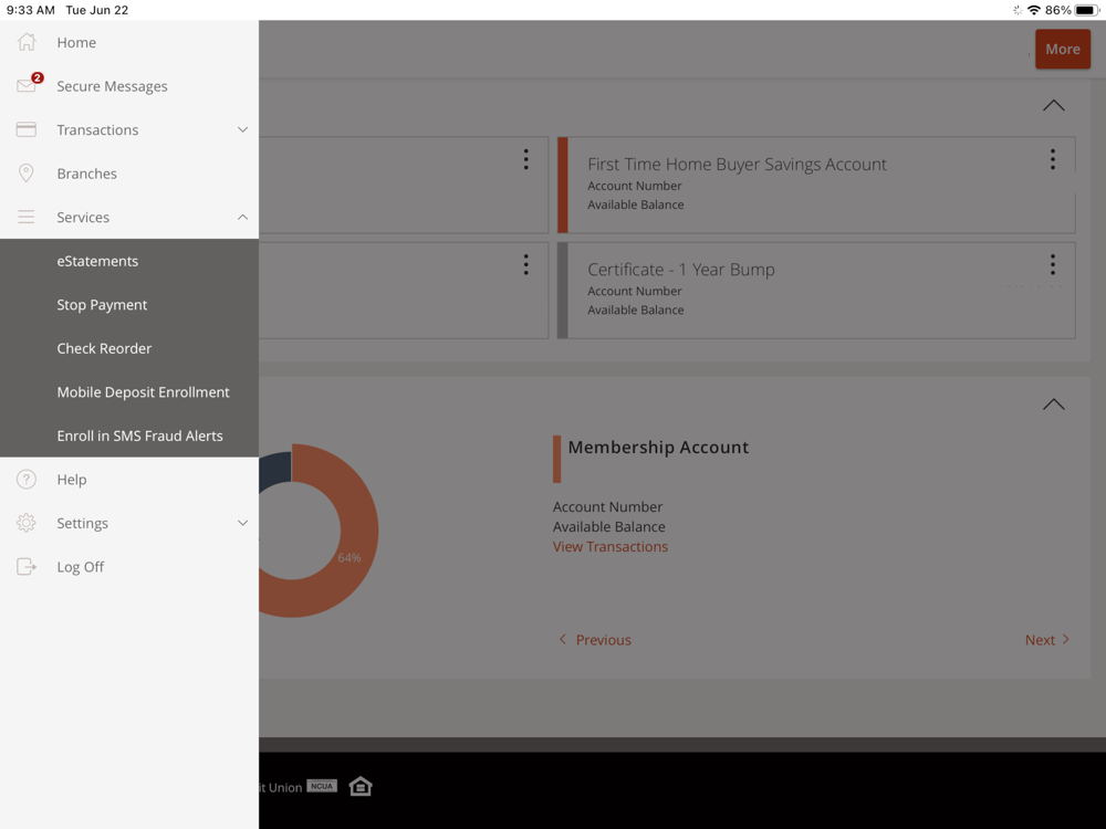 - Accounts: Quickly view balances and the most recent 100 transactions for any account or loan.