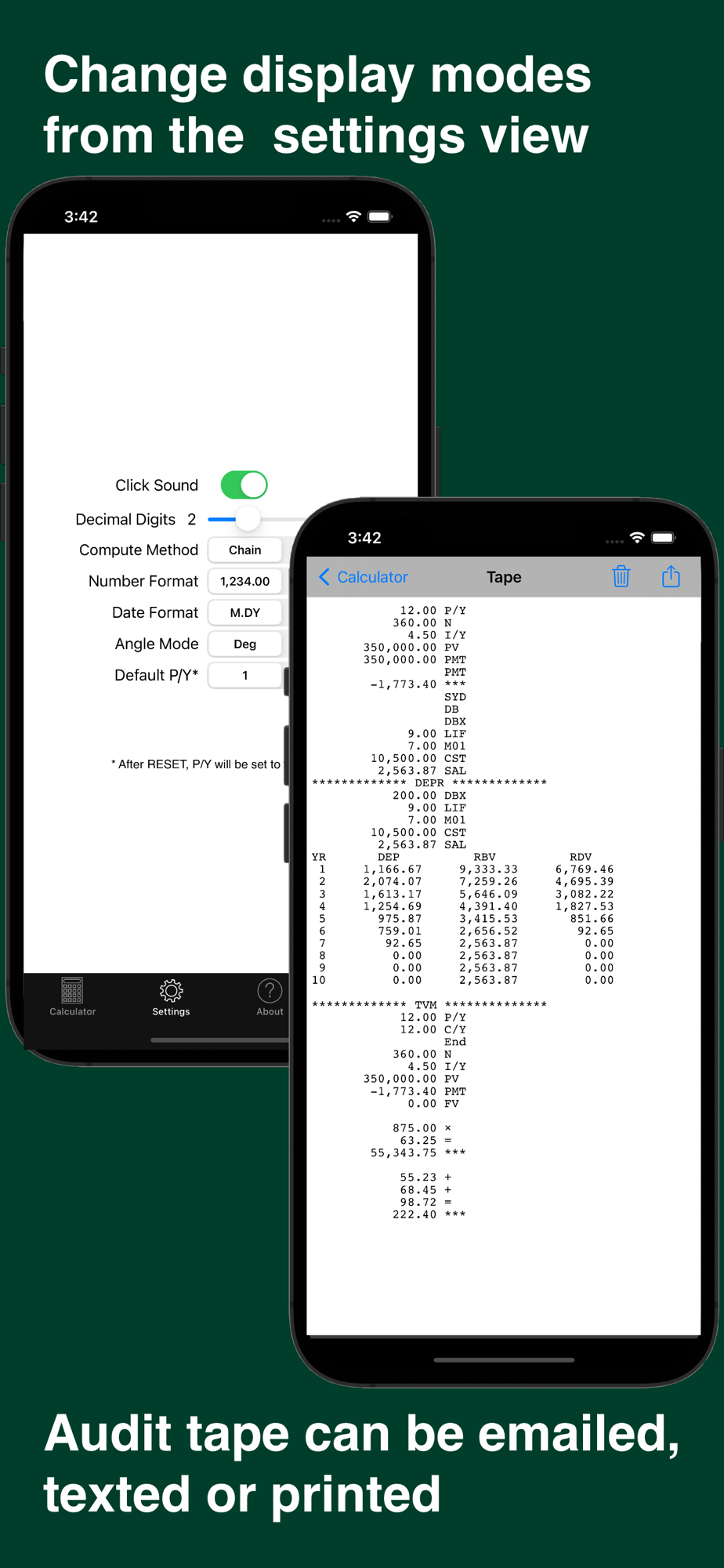 •full set of scientific calculations including logs and trig functions