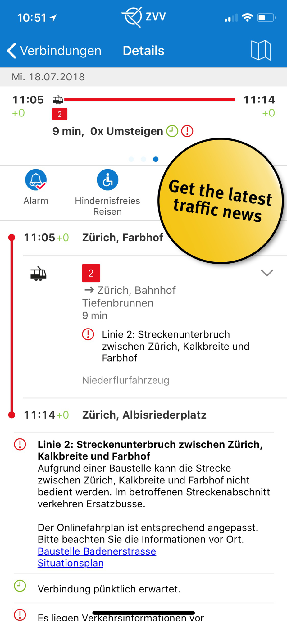 The timetable for the whole of Switzerland in your pocket: The ZVV timetable app shows you the fastest connection between stops and addresses. Save your most important locations and connections as favorites and get to your timetable quickly and easily. Display the next departures from a (nearby) stop or define this function as the start page. The ZVV timetable app informs you about timetable changes due to construction sites, events or unexpected events on the ZVV network. Buy your timetable directly in the ZVV ticket app.
