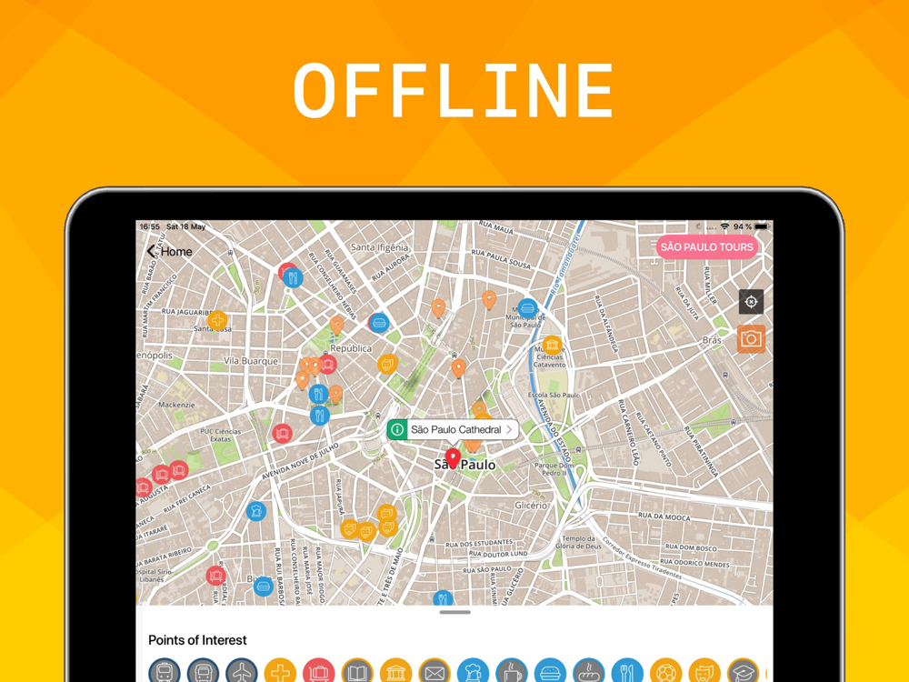 - INTERACTIVE POINTS OF INTEREST on the maps showing public bus stops, restaurants, pubs, hotels, hospitals, museums, theatres, and many others.