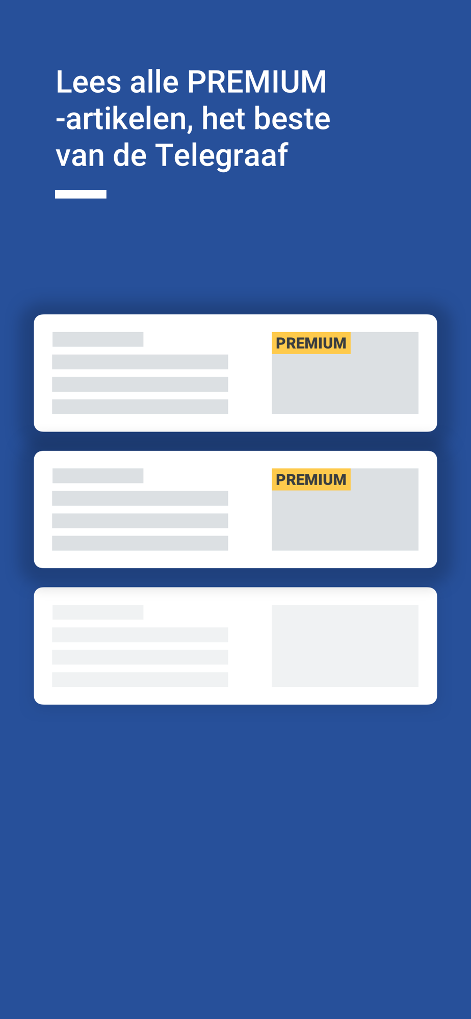 De app is gratis beschikbaar. Alles van De Telegraaf in 1 app met de toevoeging van de digitale krant. De digitale krant is toegankelijk voor abonnees met een digitaal en een combi abonnement op De Telegraaf. In de app vind je ook PREMIUM-artikelen. Deze artikelen bieden het beste van De Telegraaf en opinie van onze bekende columnisten. In de app zijn de PREMIUM-artikelen herkenbaar aan het gele label “PREMIUM”.