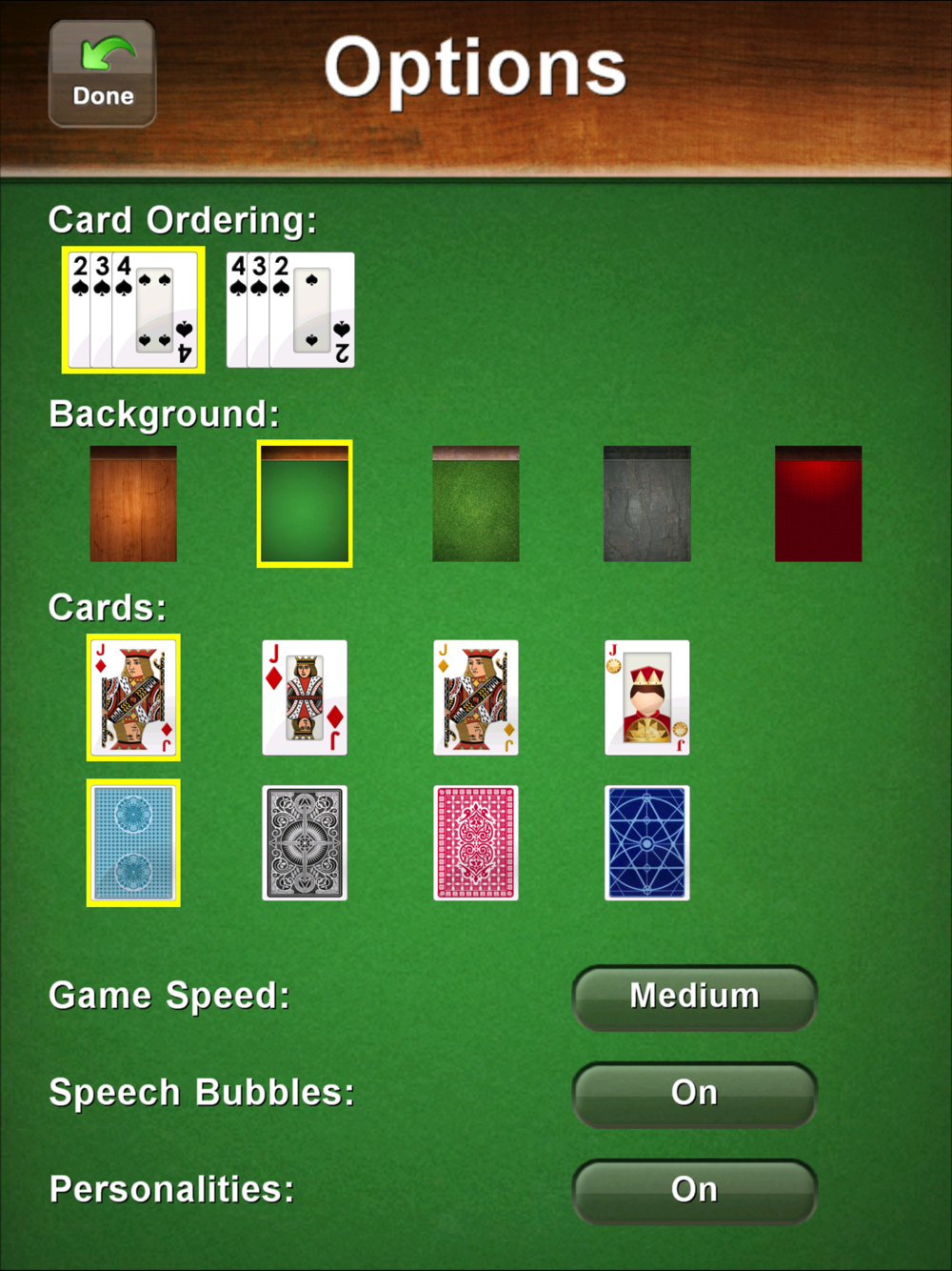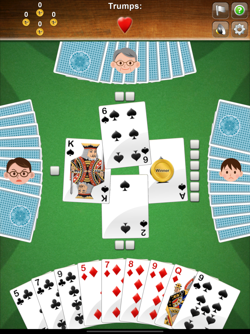 It's got a powerful AI so you'll never have an easy game (I write AIs for a living!) and a huge range of customisable rule options to suit however you've traditionally played the game yourself. The AI players even have emotions and get happy and sad when they think they're going to make their bid or not. You can also play against your friends on their own devices over local WiFi or Bluetooth.