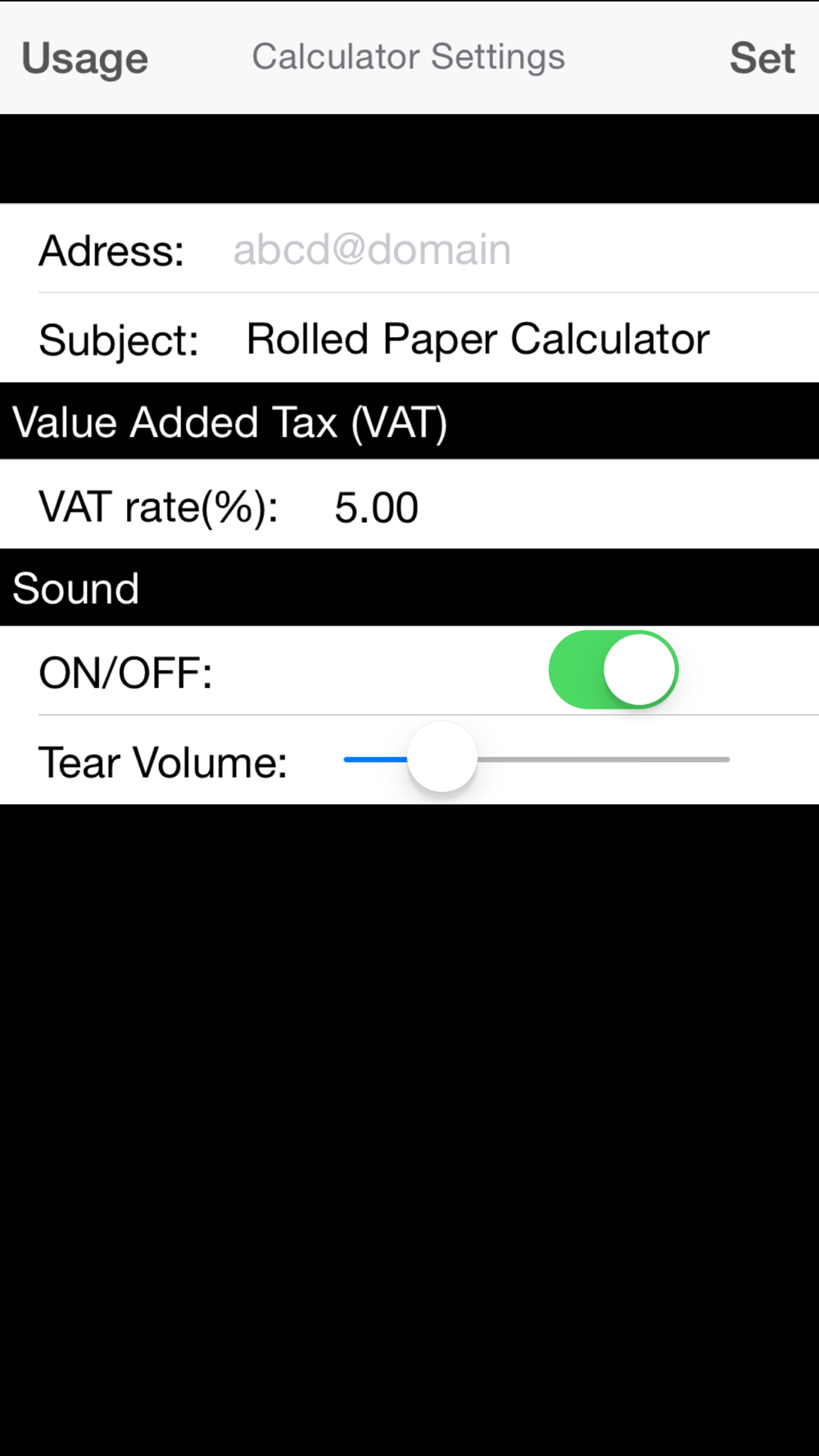 you can set the data of address , subject , volume of sound and VAT rate (Default 5%).