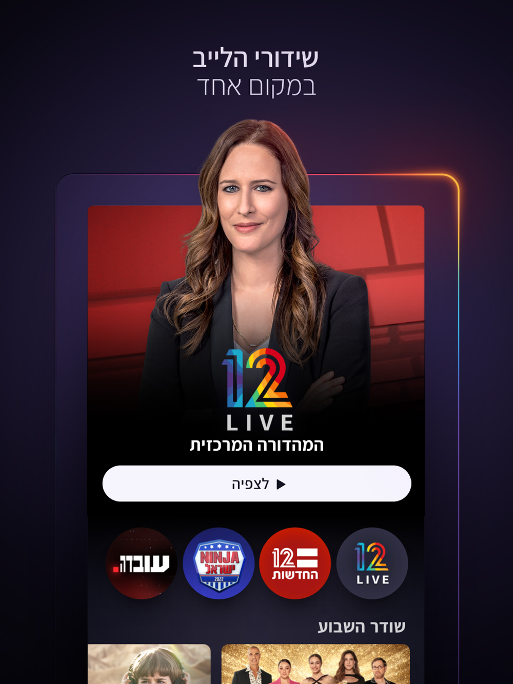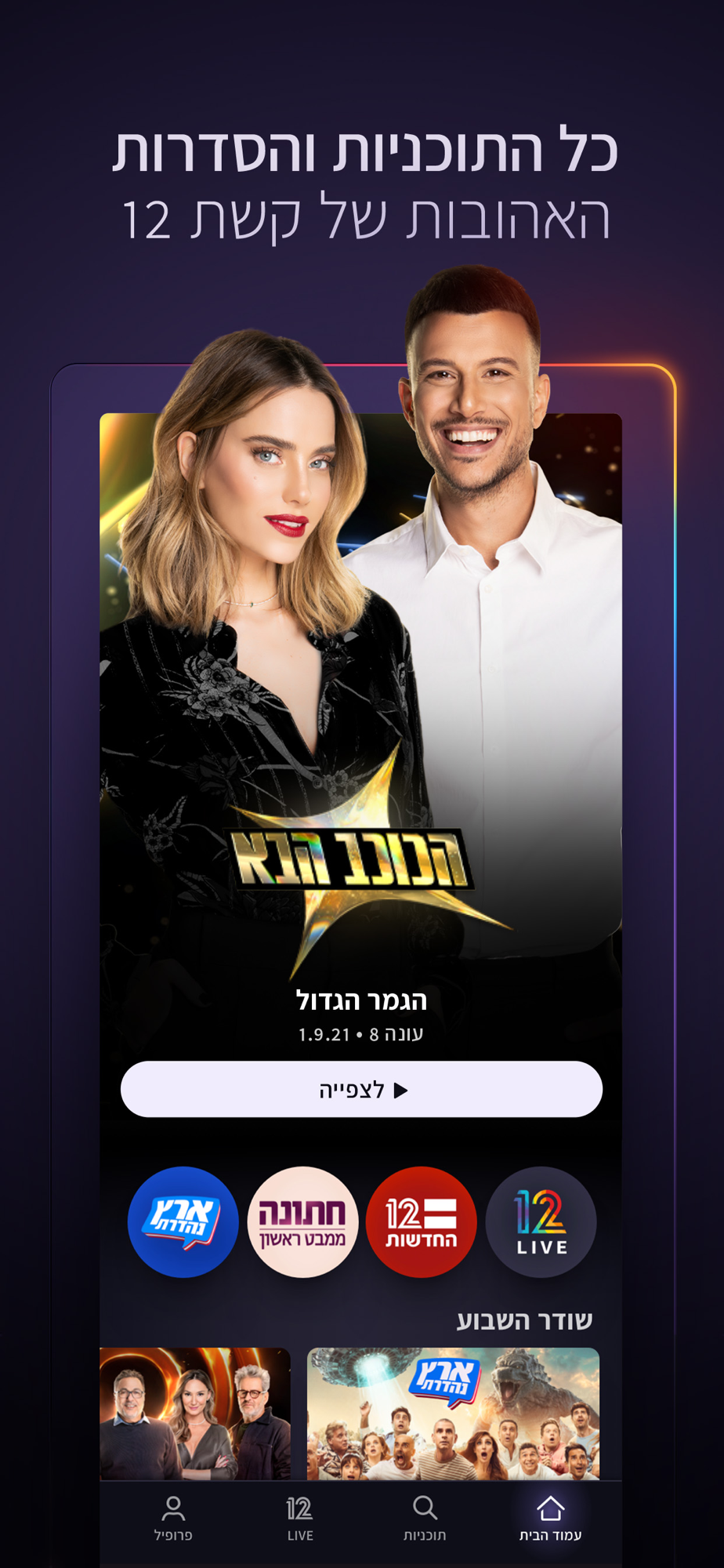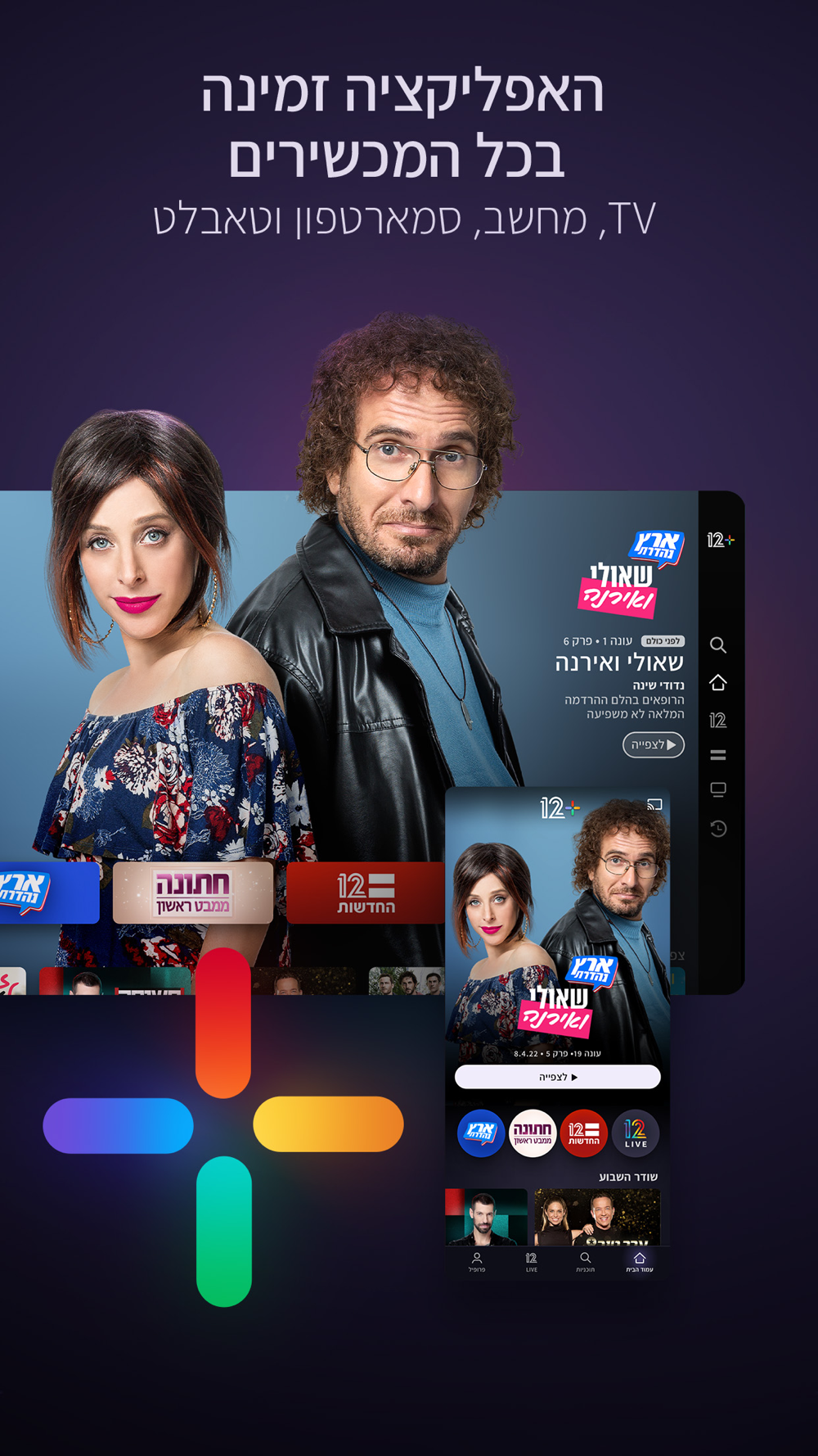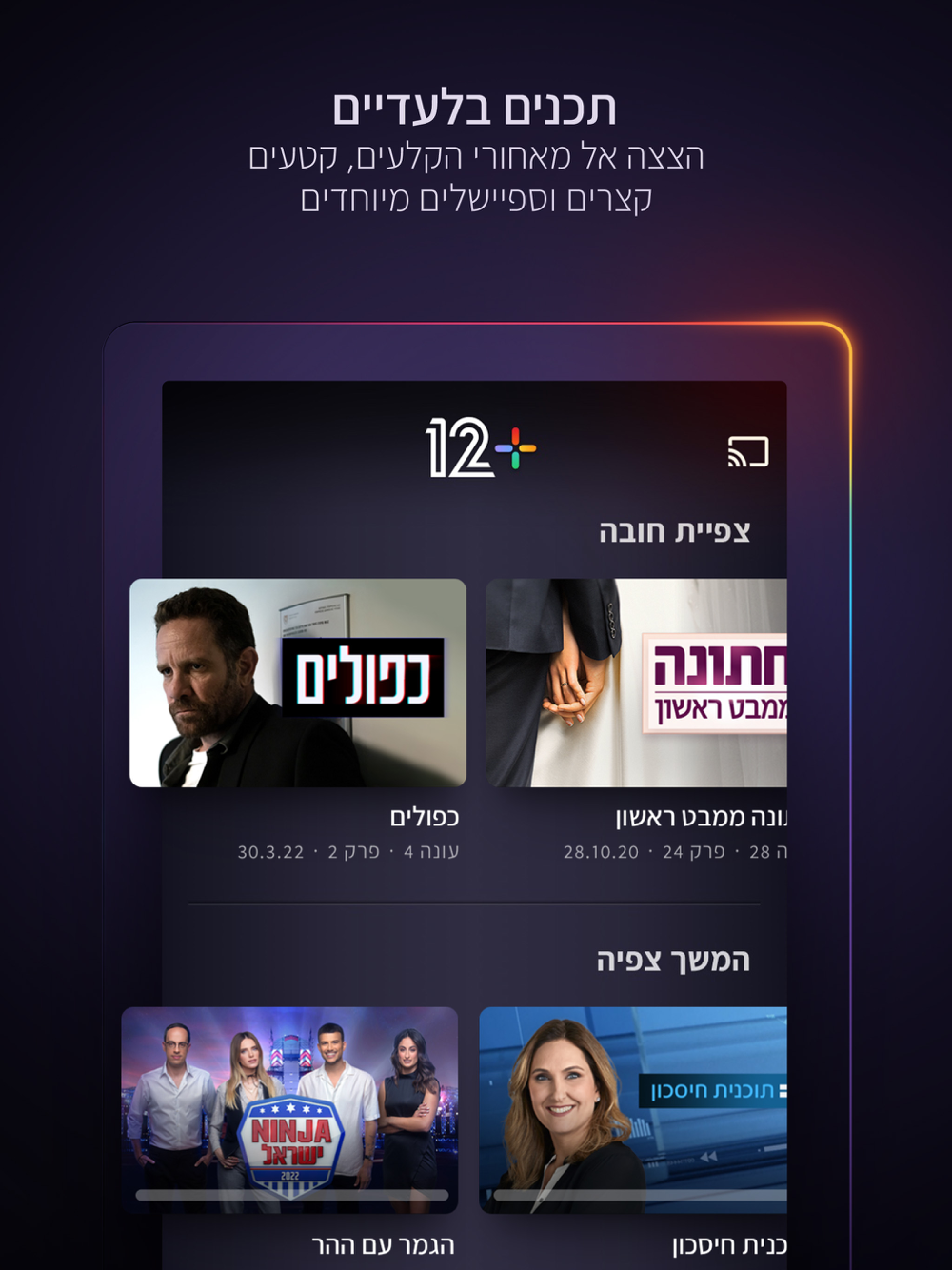 Welcome to 12+, Keshet12's new streaming app, with all of Israel's most popular shows and stars. Download 12+ to your TV, smartphone, and tablet and enjoy the most advanced and convenient way to watch Keshet12's live broadcast and VOD back catalogue, with decades of excellent seasons and series as well exclusive behind-the-scenes and additional content.