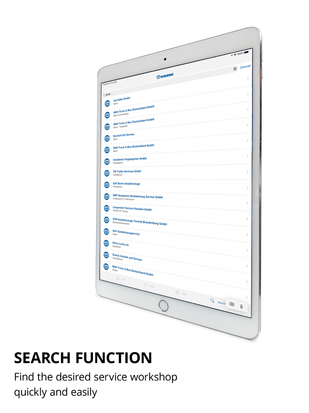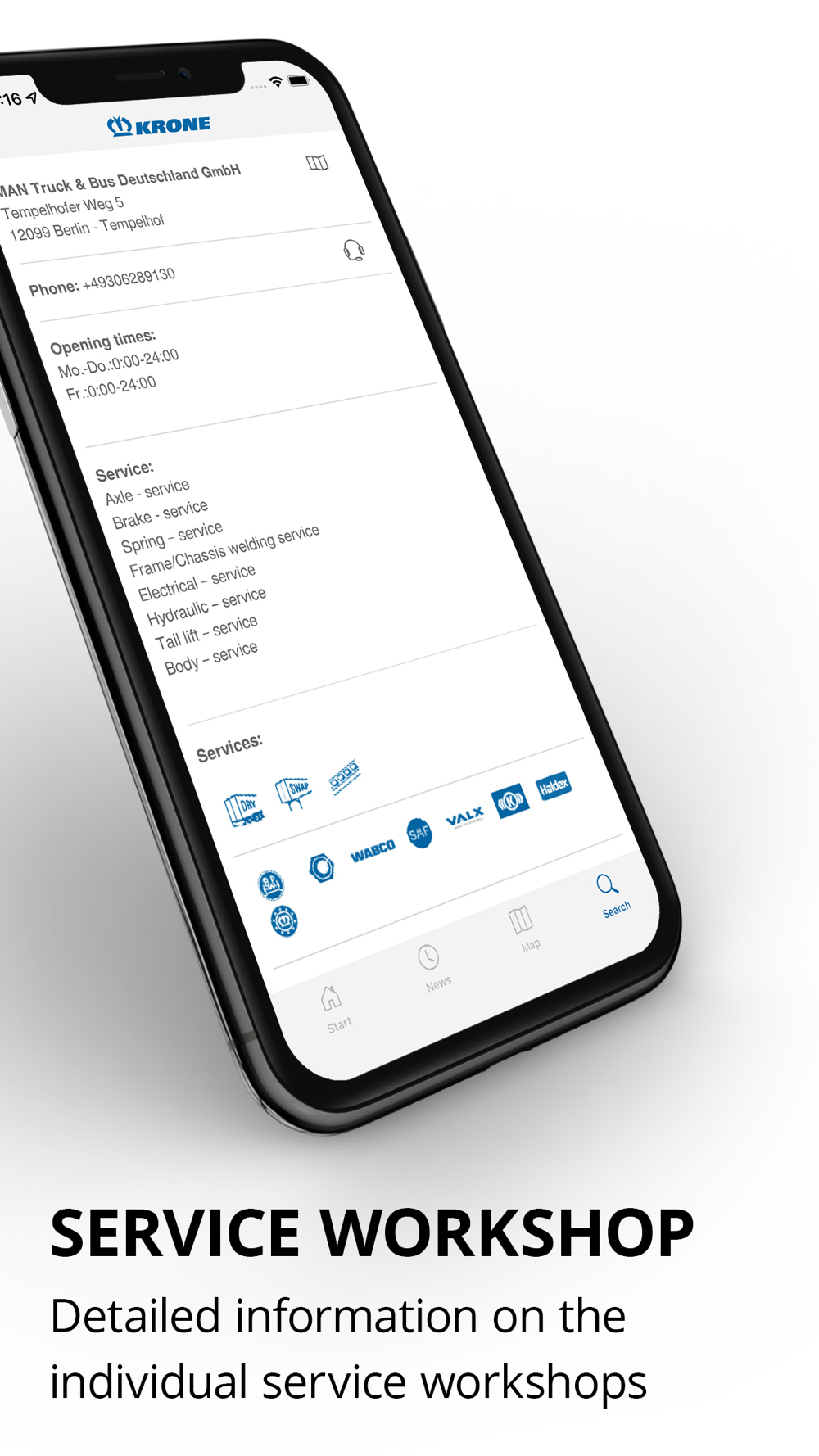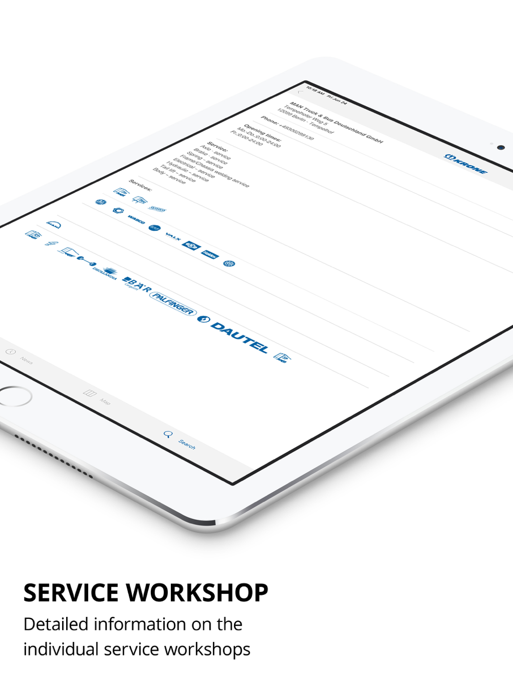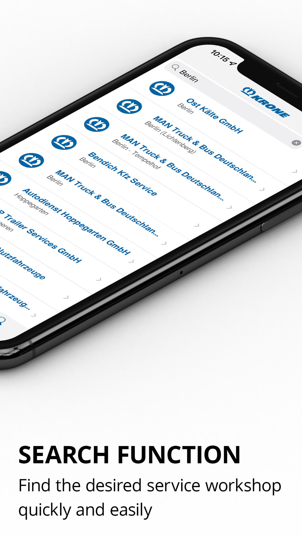 This app helps you to quickly and easily find KRONE service stations near you. No matter where you need help in Europe, the KRONE Service Locator helps you to locate the right service station. Just enter the location of your vehicle in the search mask and select the component concerned. The KRONE Service Locator lists the nearest service stations to you within seconds.