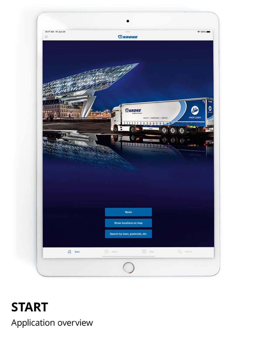 From the central starting point ("House“symbol) you can select the various functions of the app just by touching. The "Map" function allows you to display your present location on a map. In addition, the nearest 5 KRONE service stations are displayed. Touch the respective logo to call up further information in a detailed view.