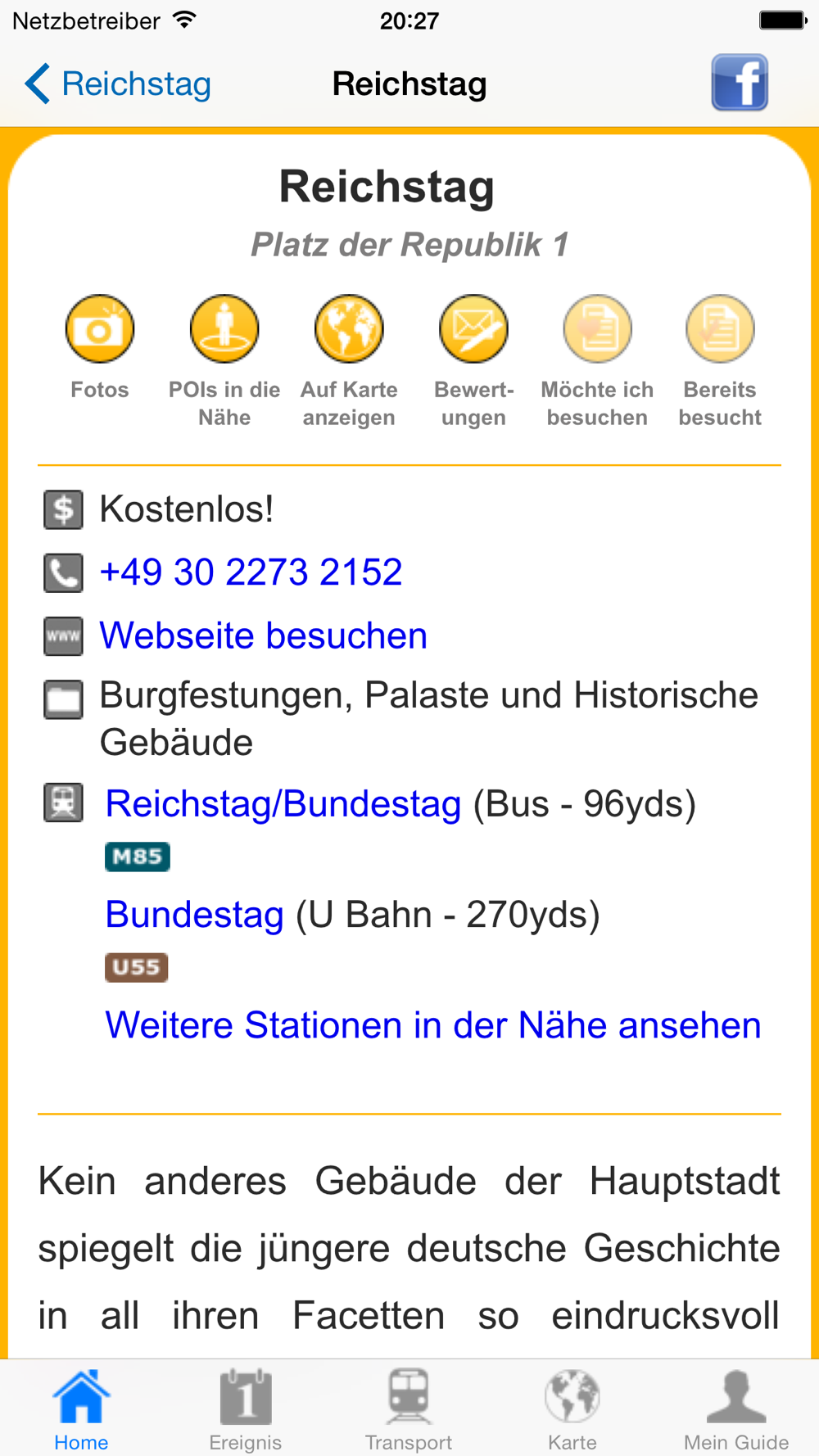 • Einbindung in Facebook, so dass Sie Ihren Freunden zeigen können, wo Sie waren.
