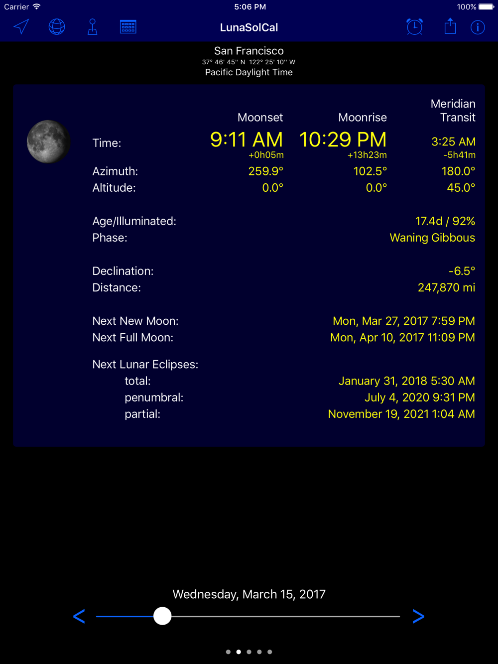 To specify the location of interest either get the position from the built-in GPS or Wifi receiver or select a city from a database with over 400,000 cities in over 200 countries.