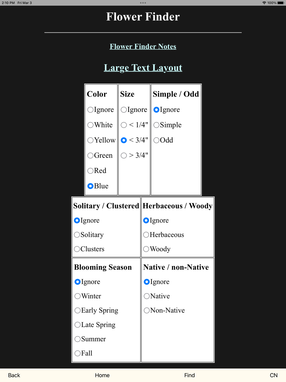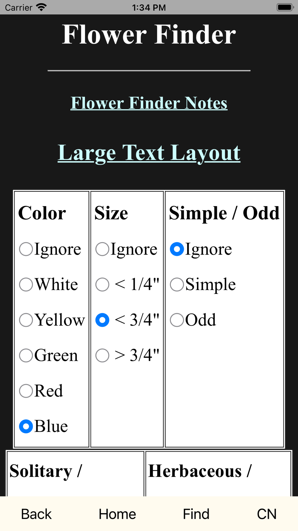 Visitors can chose several basic flower characteristics on the App's interface like color, size and shape. Based on those characteristics, the App presents several possible photographs to compare to the actual flower. Flowers that are more difficult to identify often come with several photographs so that visitors can confidently make an accurate identification.