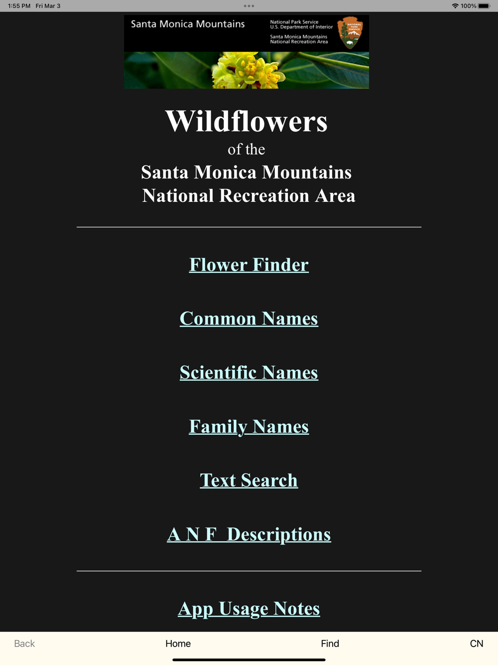 The National Park Service invites you to take along a virtual botanist the next time you visit the Santa Monica Mountains. With over 1000 plants and 7500 photos, this App offers both novice and advanced wildflower enthusiasts the opportunity to identify common and rare plants while exploring remote areas of the Santa Monica Mountains.