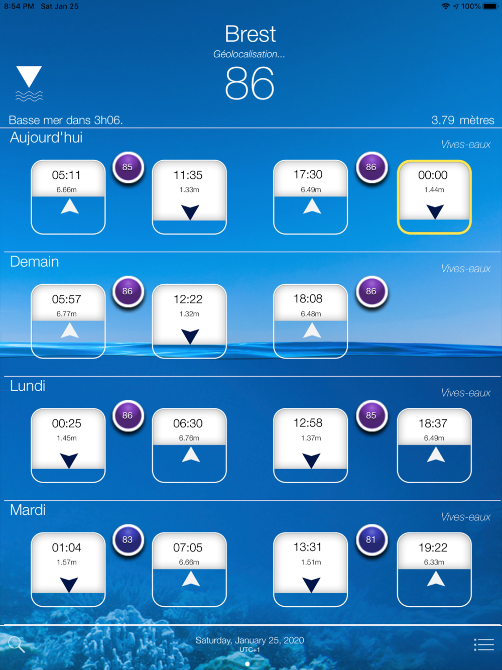 -Affichage rapide et synthétique des marées pour les 7 prochains jours.