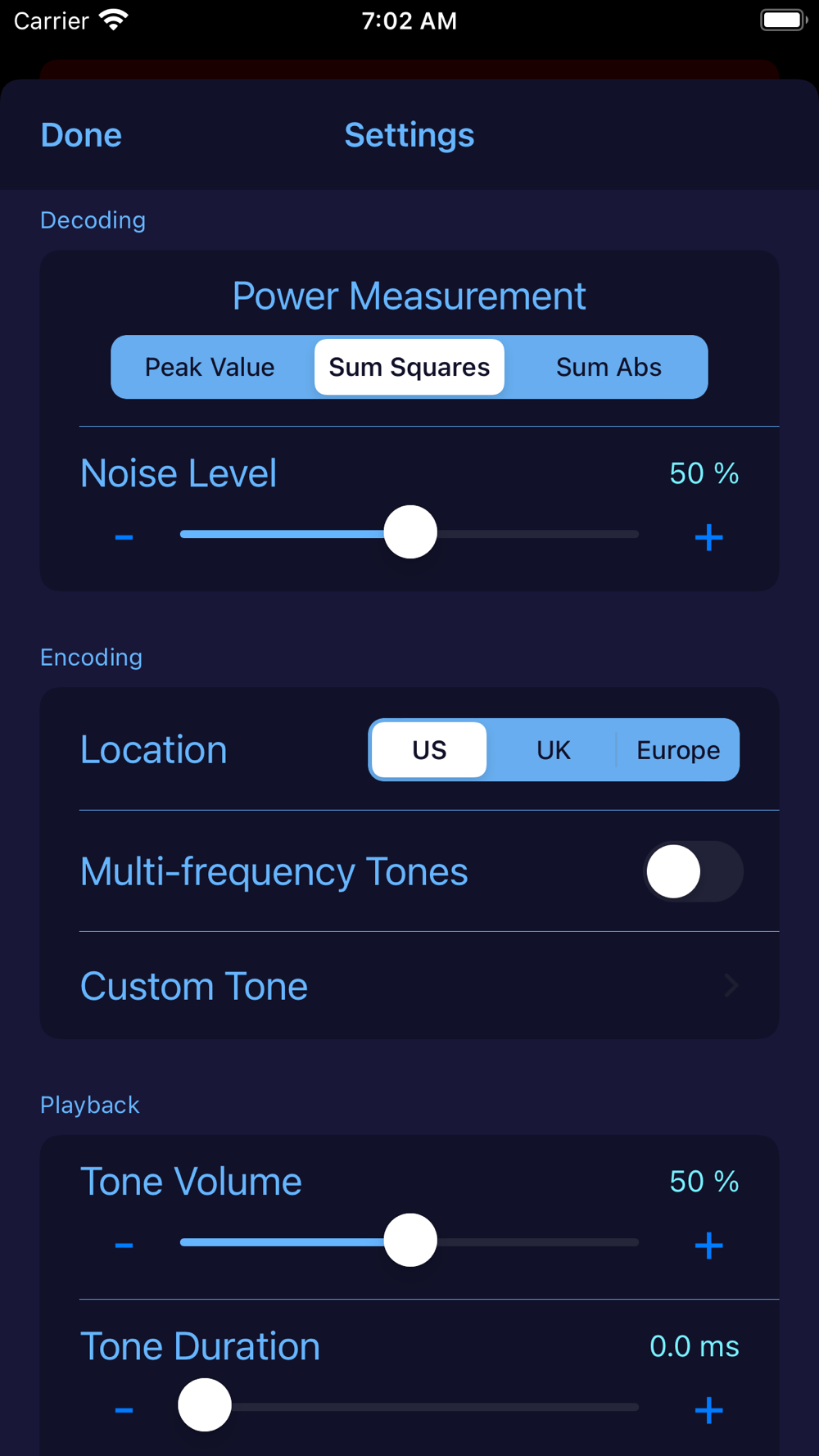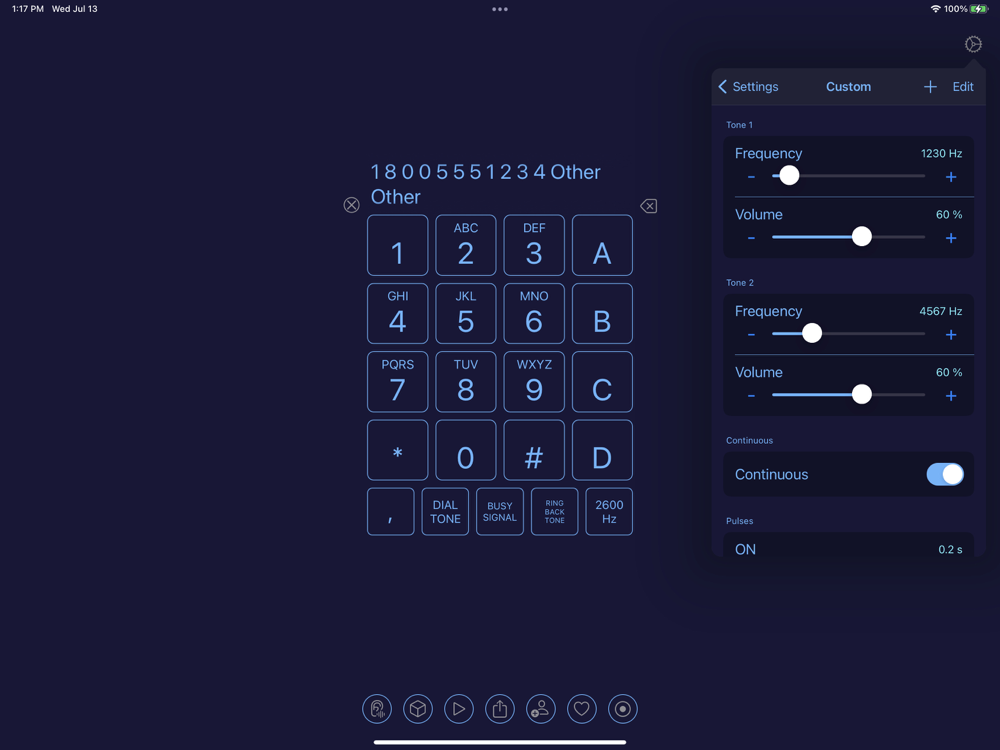 Create a custom tone with control over individual frequencies and volumes. The custom tone can consist of any number of on and off pulses and can optionally be continuous.