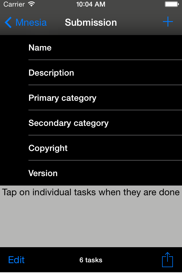 Mnesia lets you work with checklists in a structured way. First you design a master checklist in an easy way. An example could be a "Go Camping" checklist where you add each task you need to perform before you are ready to go camping.
