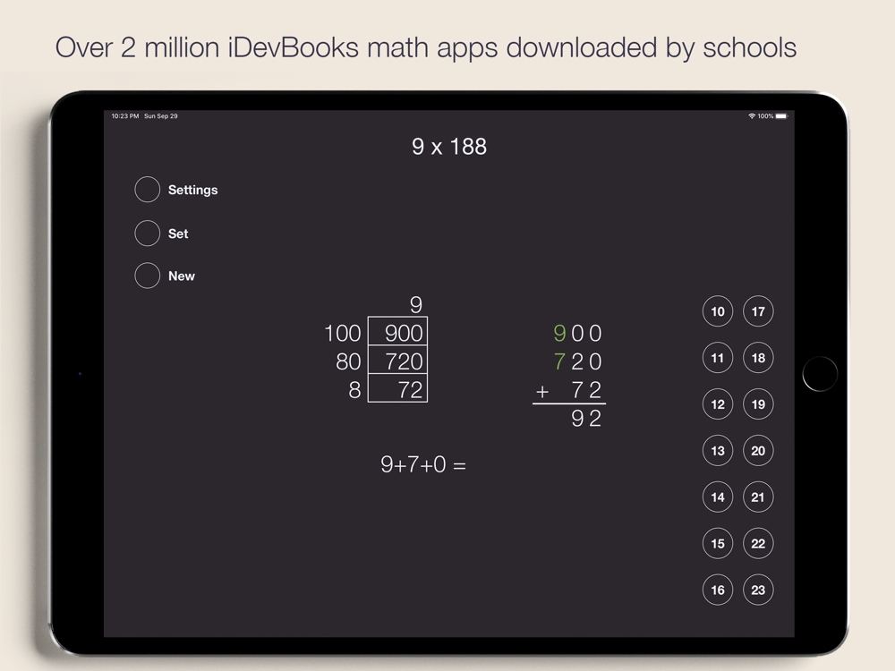 Some of the other 40 iDevBooks math apps are Column Addition, Long Multiplication, Long Division, Column Subtraction, Visual Multiplication Table, Partial Differences Subtraction, Partial Products Multiplication, Partial Sums Addition, Decimal Rounding, etc.