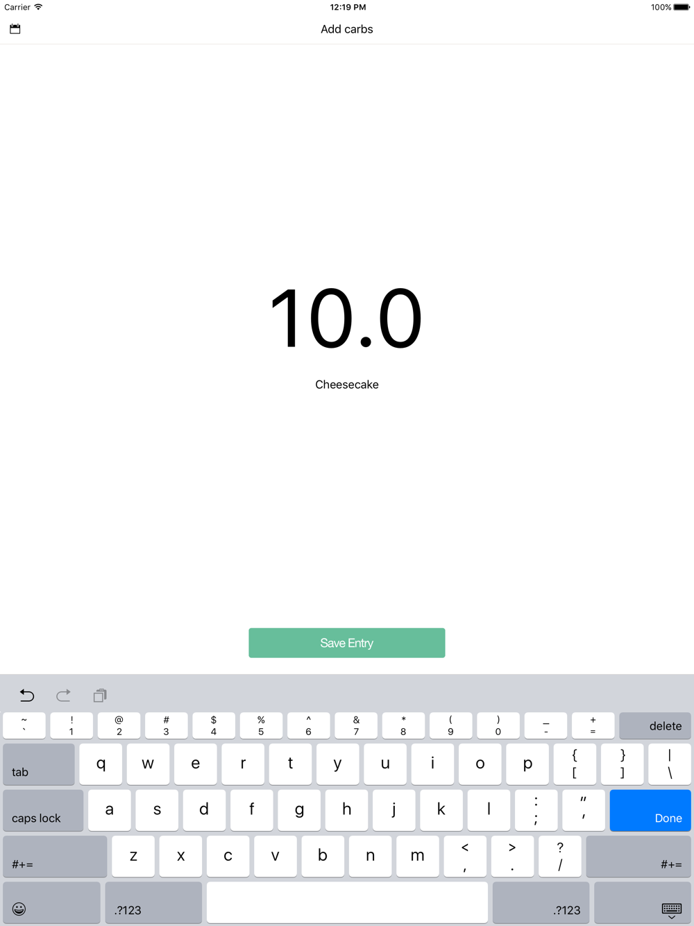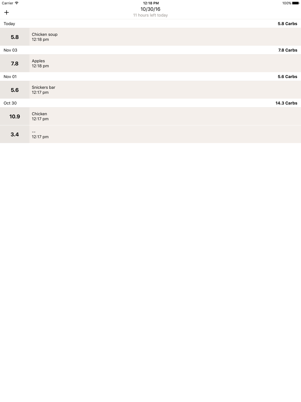 A simple no frills carb counting app. It makes it simple to keep up with your total carb count throughout the day and keep a historical record.