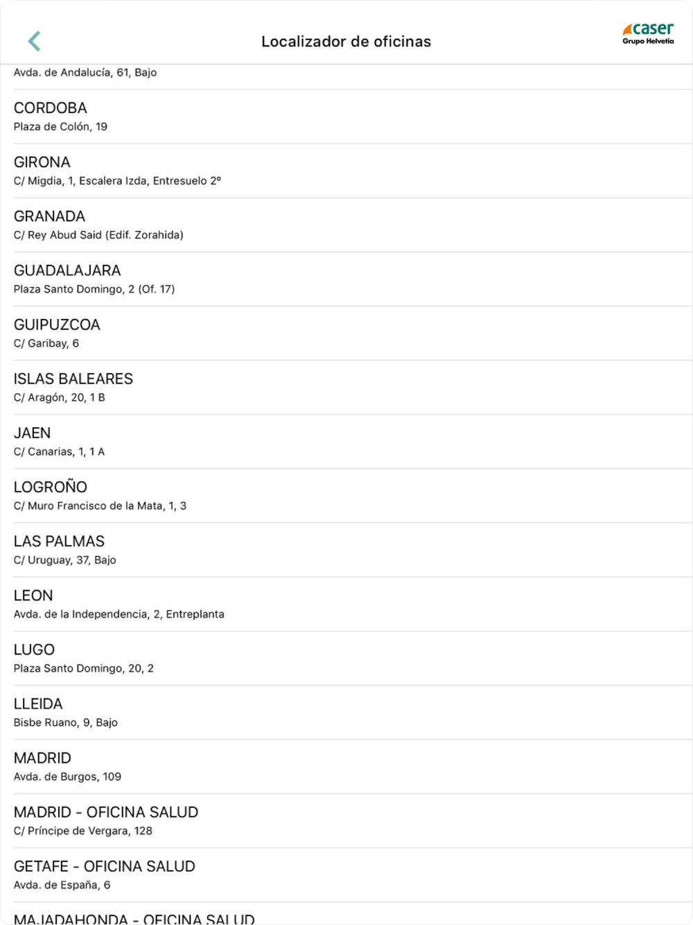 - Localización y contacto de las oficinas de Caser.