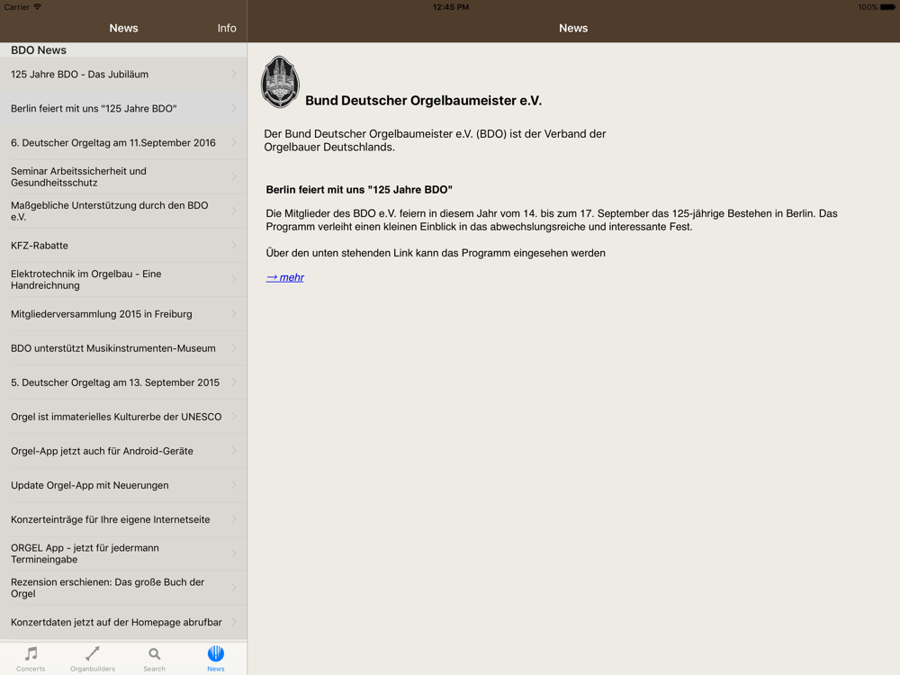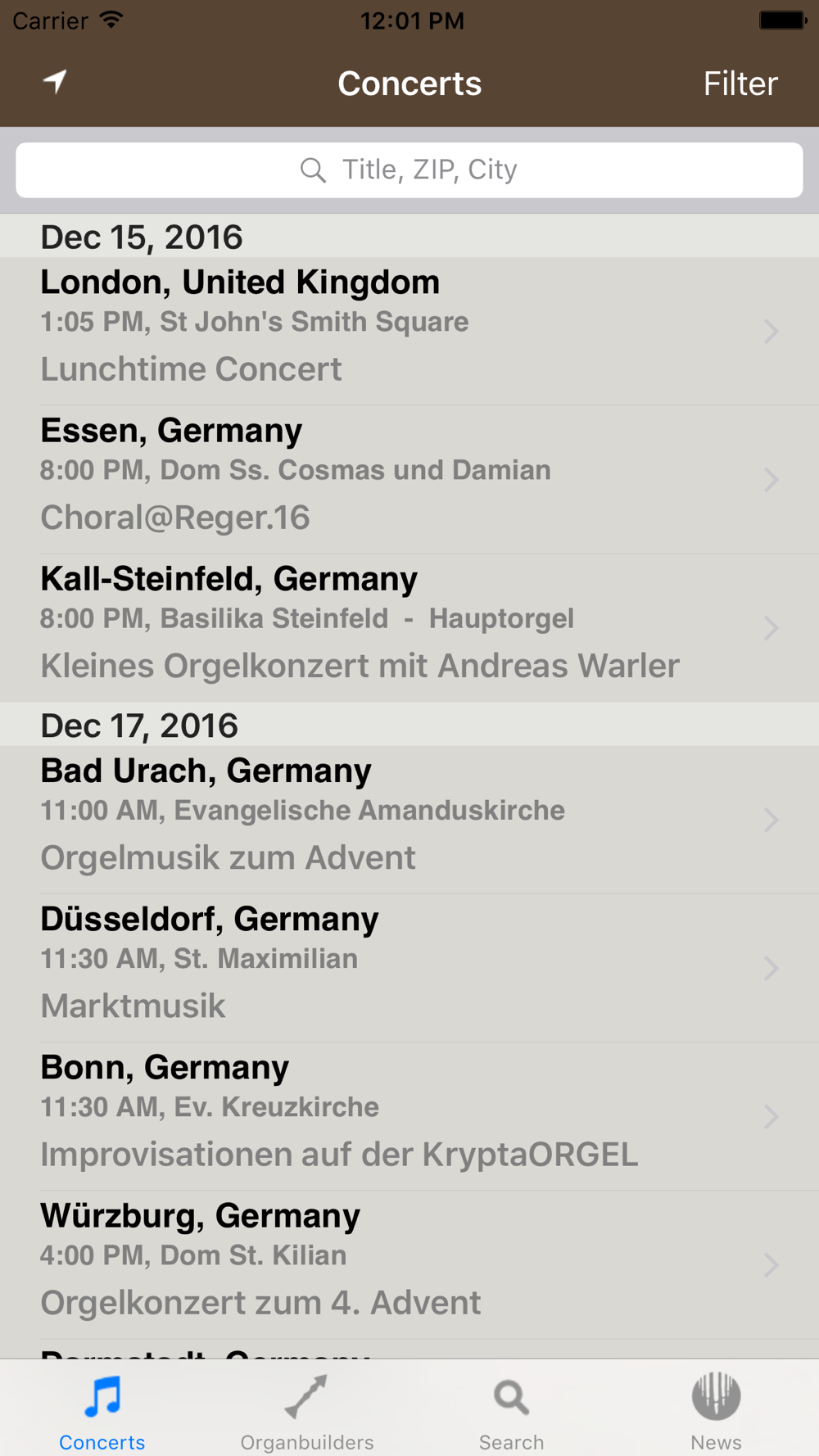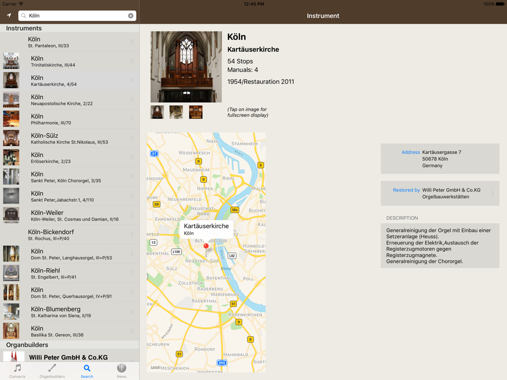 The concert calendar lists organ concerts around the world. With its GPS based "nearby" search feature, "Orgel" makes is easy to search for upcoming concerts around you.
