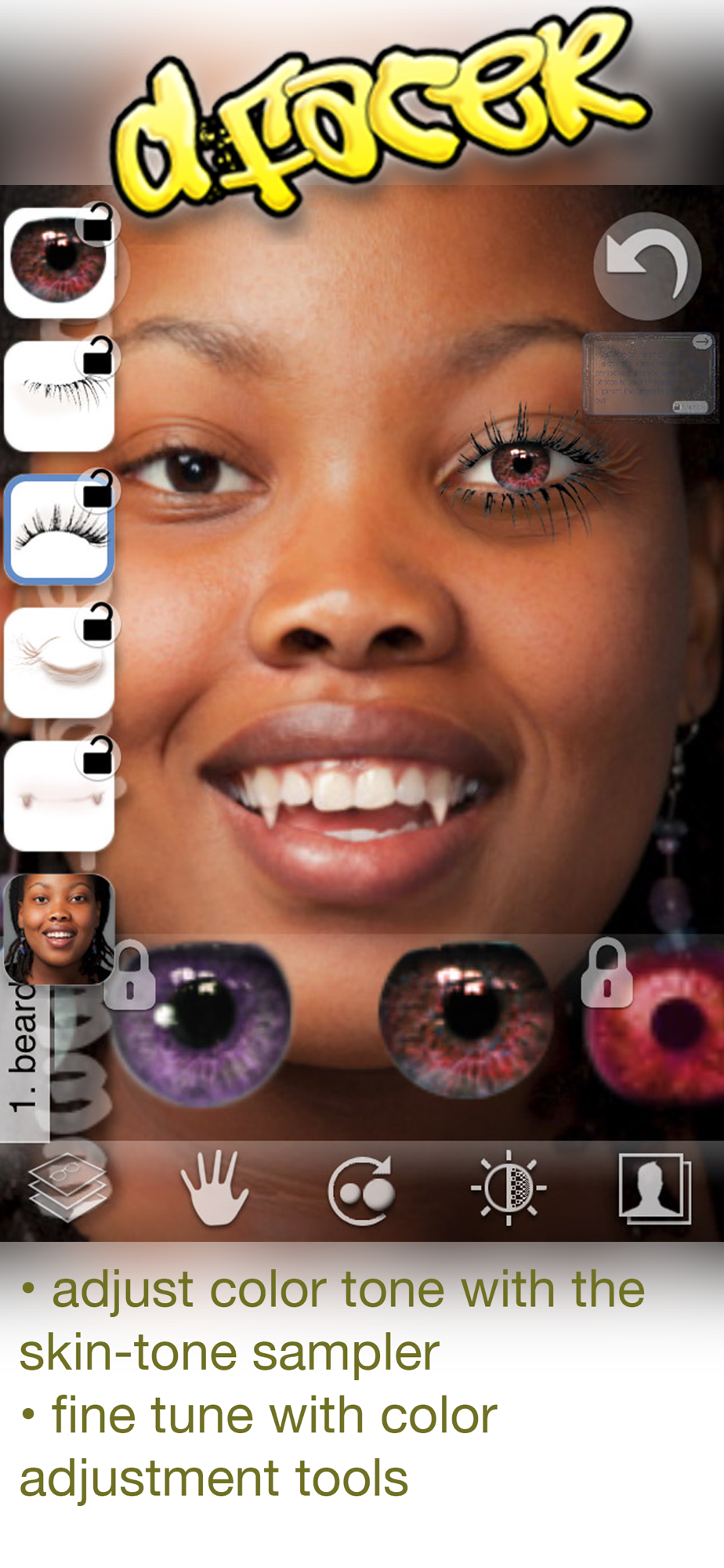 With d-Facer 'lite' you can try out some of the parts available in the full version (50% of the parts are locked), and get a feel for how everything works, but you can't save your creations (you'll need to upgrade for that). If you choose to upgrade you'll also get access to all the parts (100+!).