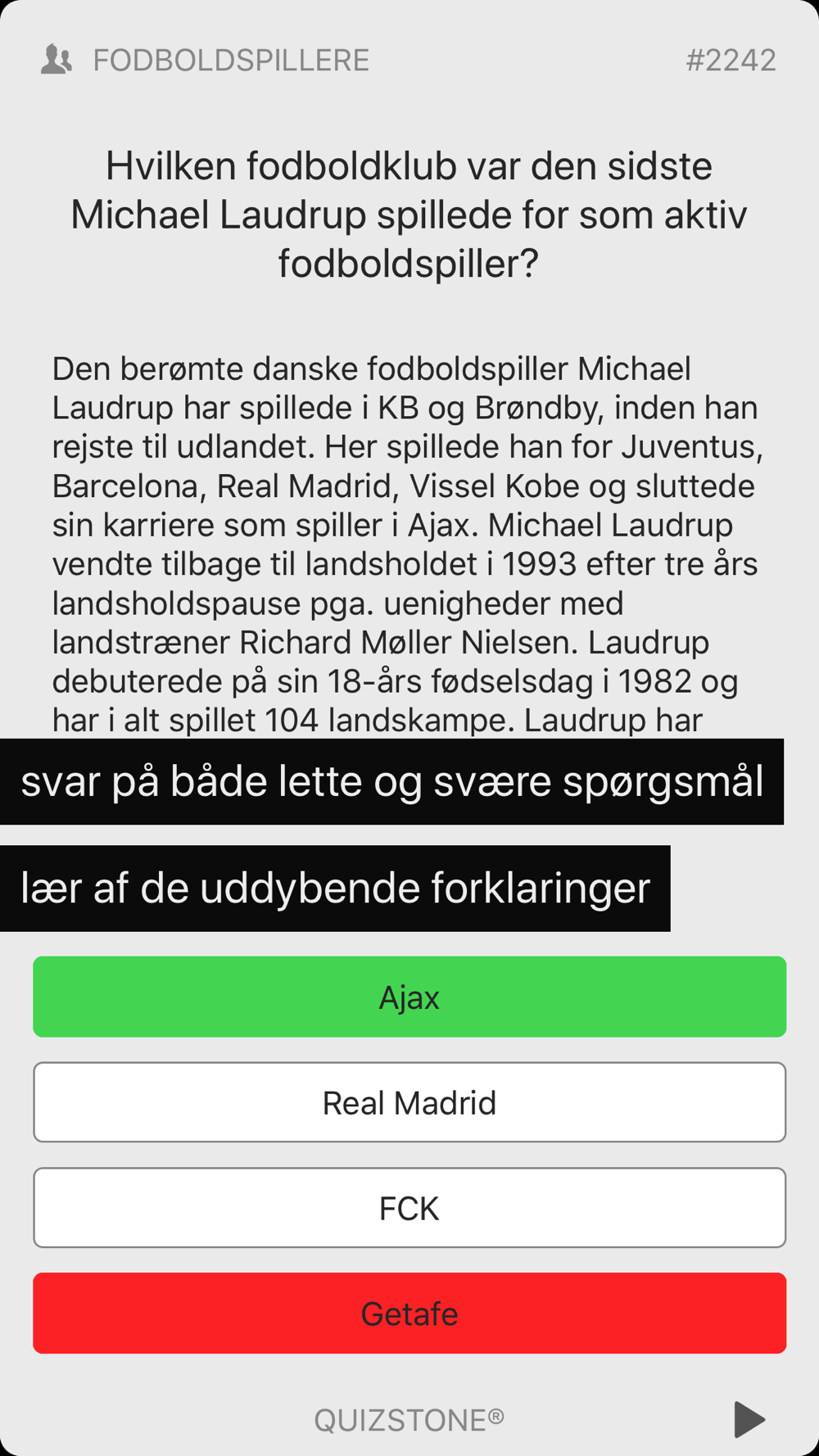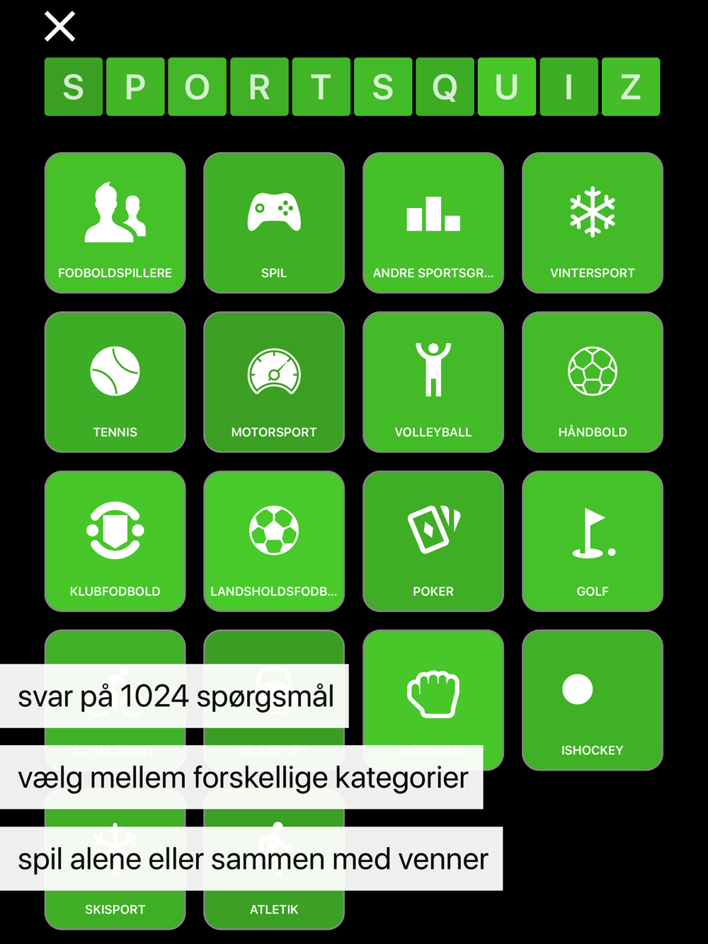 Spil Sportsquiz fra QuizStone® mod dig selv eller udfordr venner og familie til en quizkamp. Flere forskellige spilformer, masser af gode spørgsmål og timevis af underholdning og ny viden venter på dig..