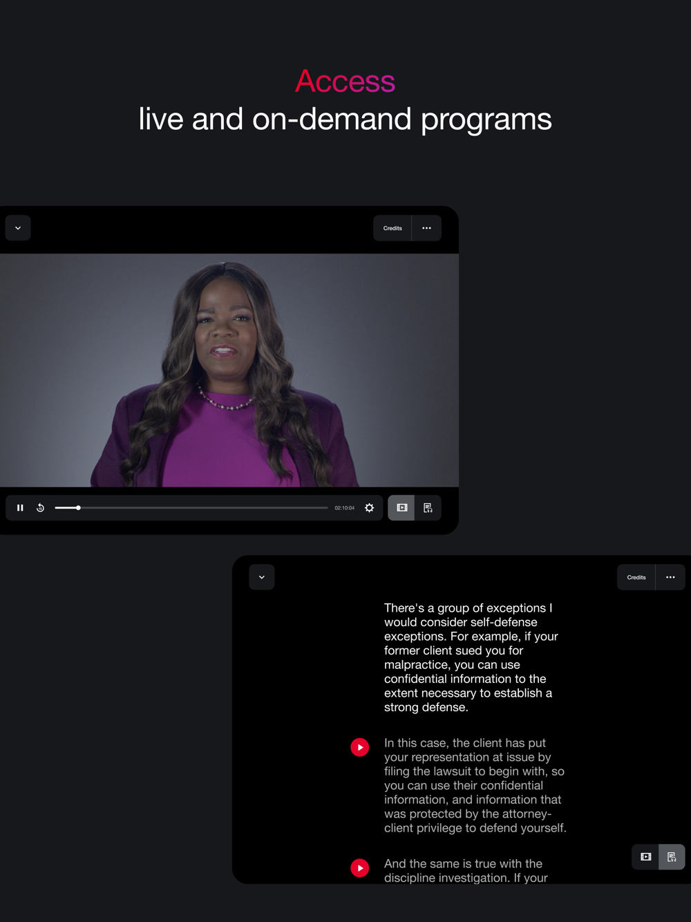 Pick up where you left off, even on a different device, then request and receive the CLE or other credits you’ve earned, all within the app.