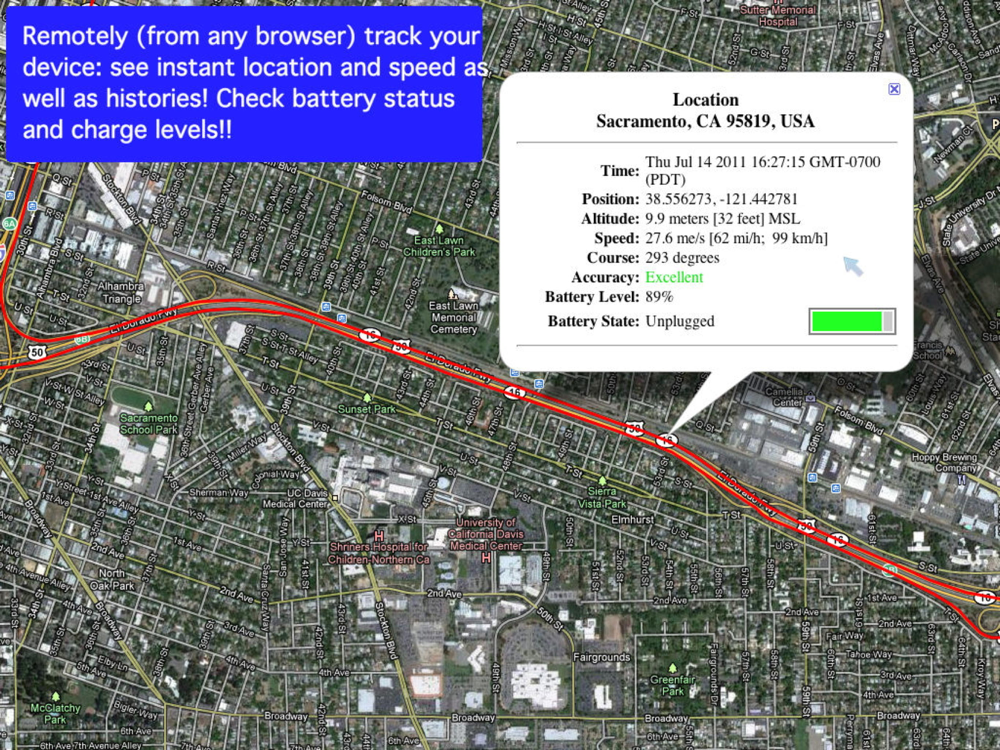 Let your loved ones track your location, whether you're out sailing in the sea, camping in the woods, navigating the urban jungle, or just walking home from school. Tracking for iPhone / Tracking for iPad enables remote tracking for your iPhone/iPad. Use it to view or share your device's precise current location AND location-histories, showing where you iPhone/iPad has been, at exactly what time, and how fast it was moving. Blog-as-you-go with timestamped location trails, photos, videos, and memos. Share your tracks with an unlimited number of viewers, or reserve sole encrypted monitoring access to YOU to track and locate your iPhone/iPad.