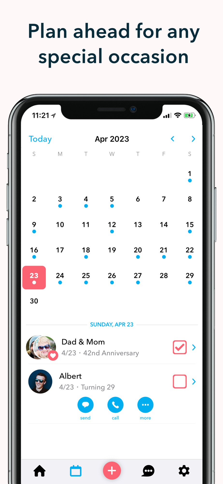 • Send personalized wishes with GIFs, text, or calls right from hip
