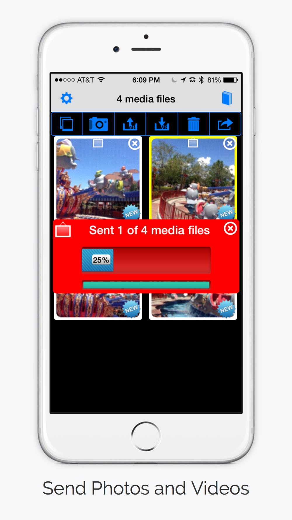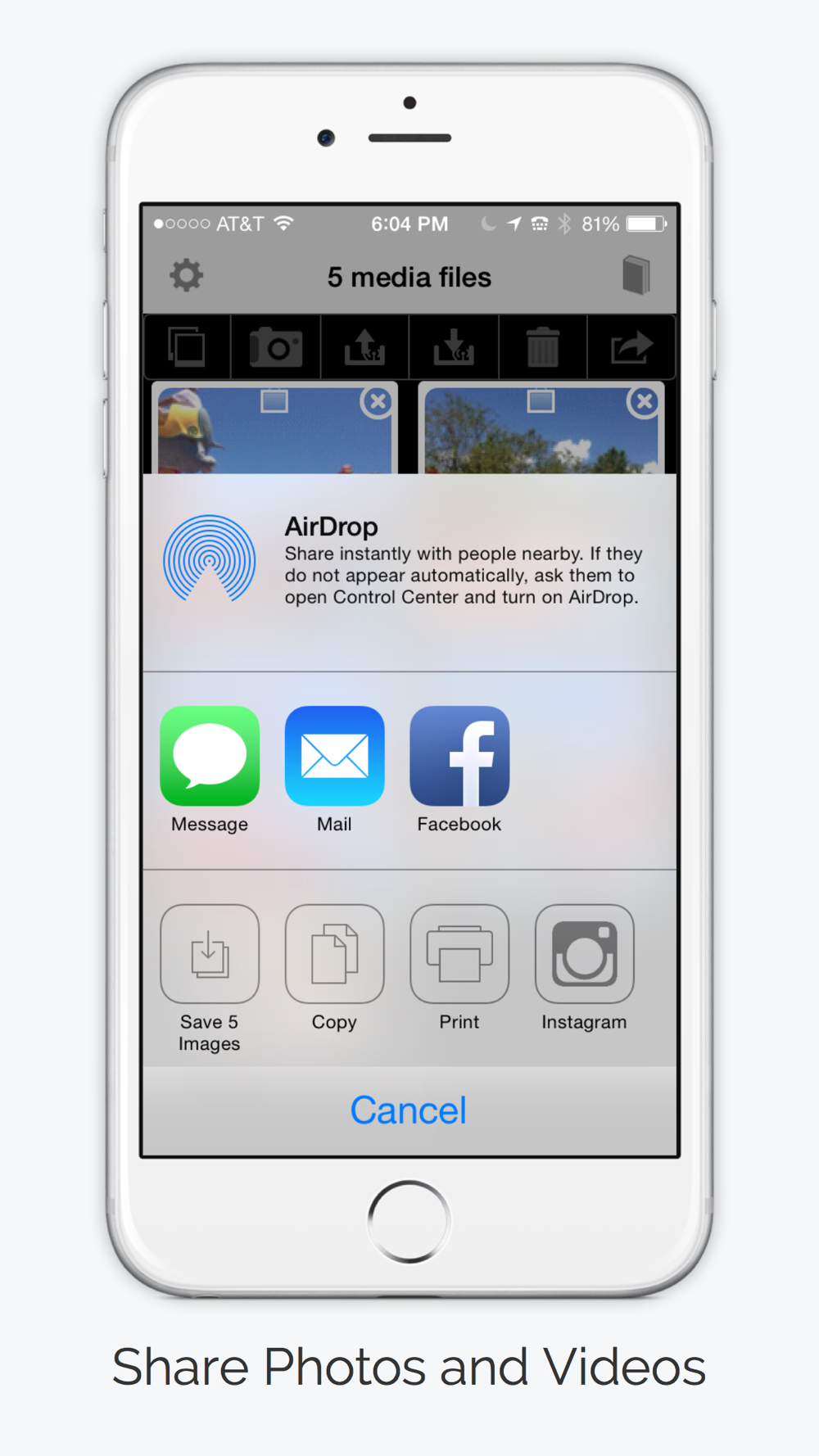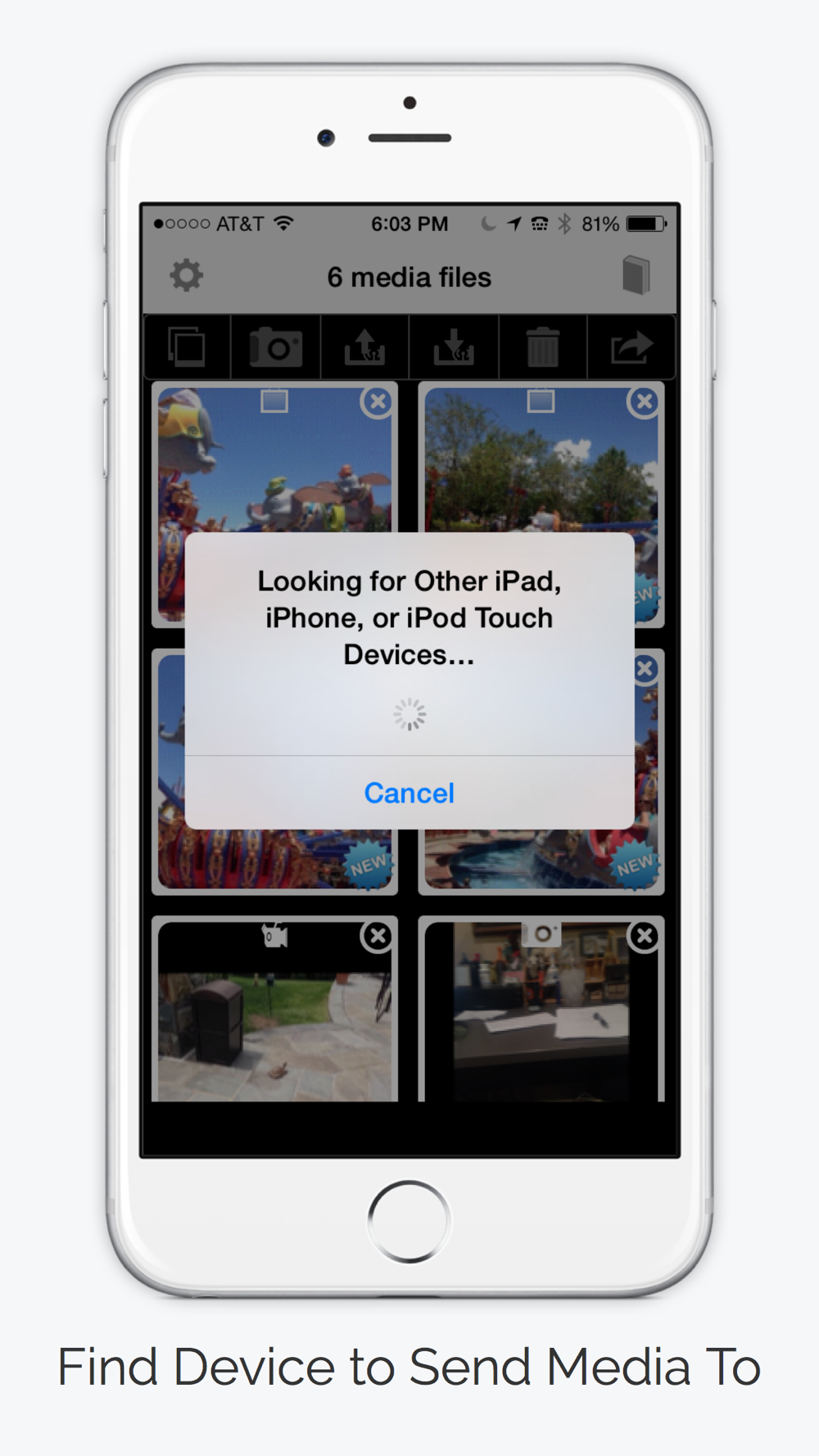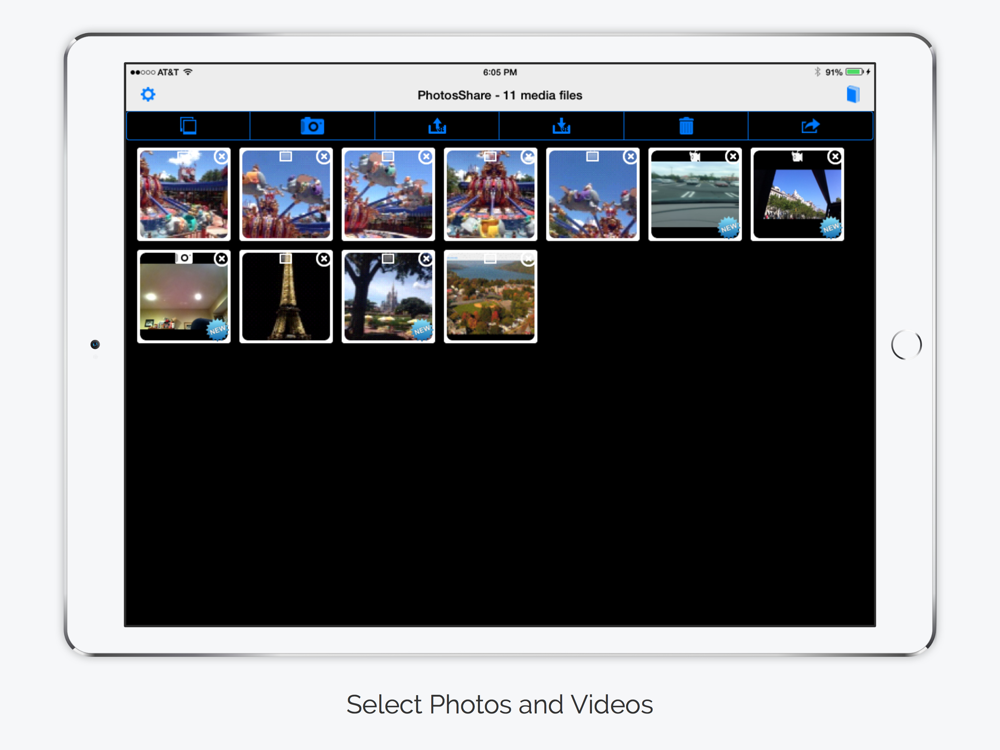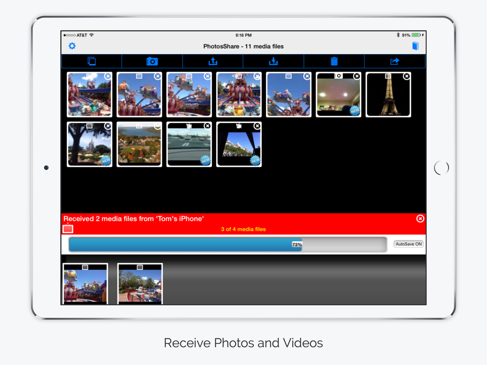 Wirelessly share any size photos and videos from one iPhone or iPad to another. You can also share using services such as Facebook, Twitter, Instagram, iMessage, Mail, Clipboard, iCloud Photo Sharing, Evernote, Instagram or even print using your printer, . Transfer full resolution photos and videos painlessly or use photo quality setting to adjust media size. New media is marked with a new icon for easy selection and number of new media is indicated.