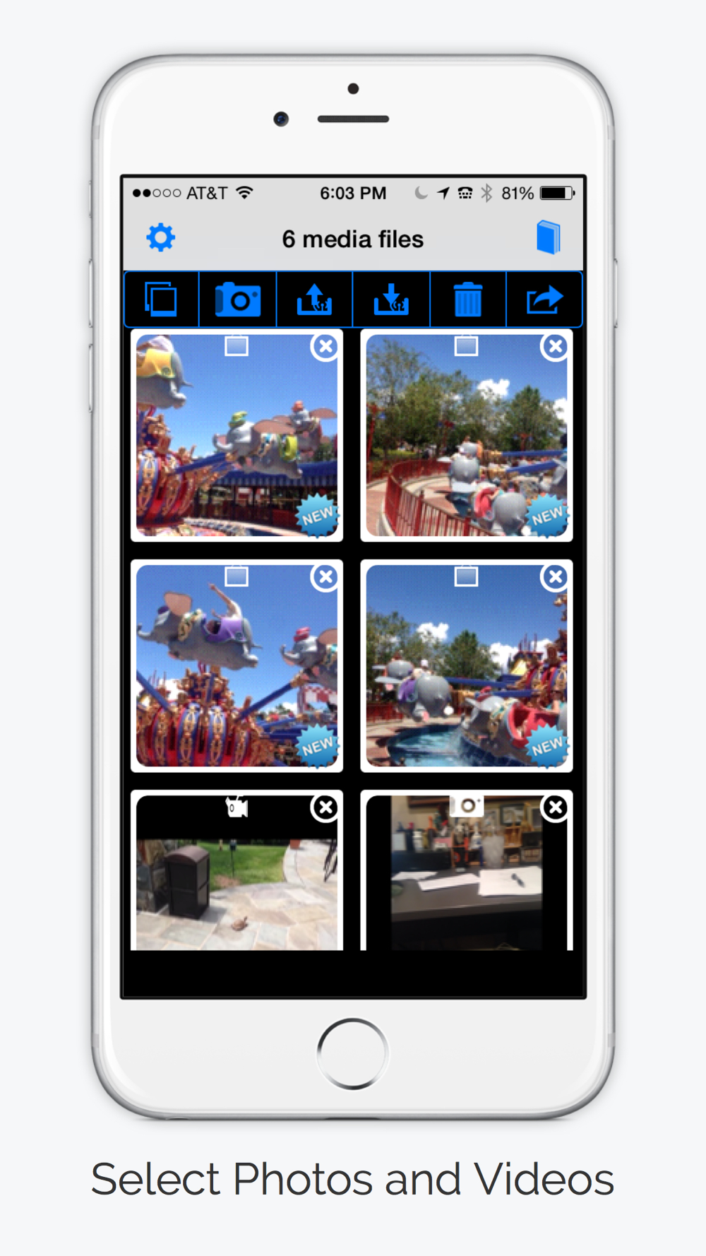 Can select from photos and videos, photos only and videos only. Also marks new photos an videos.
