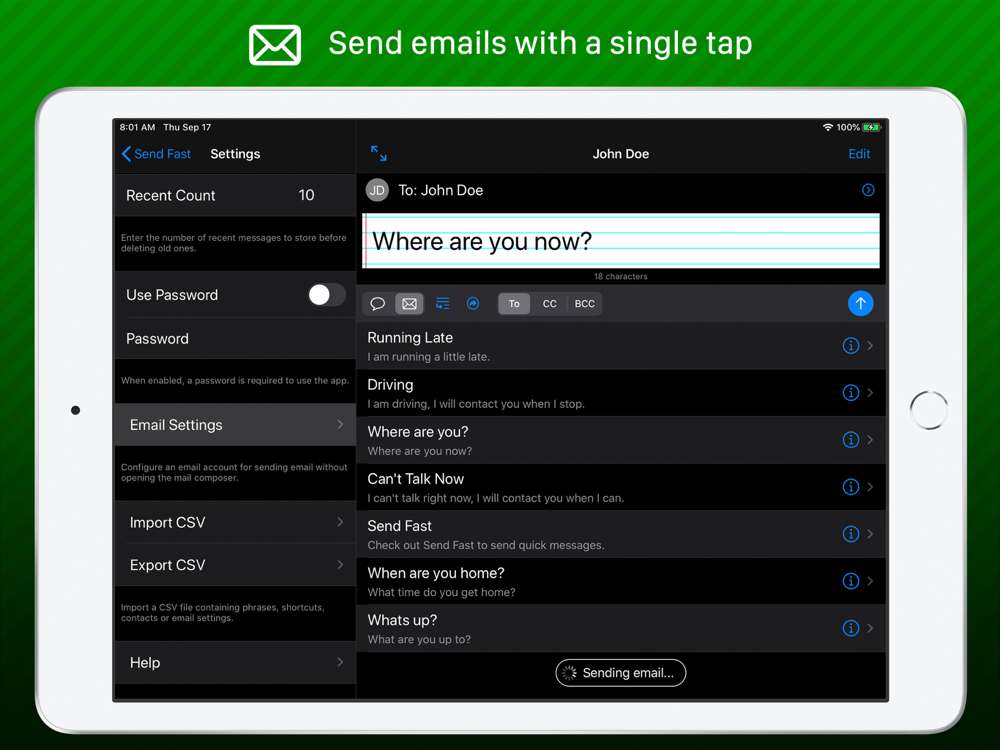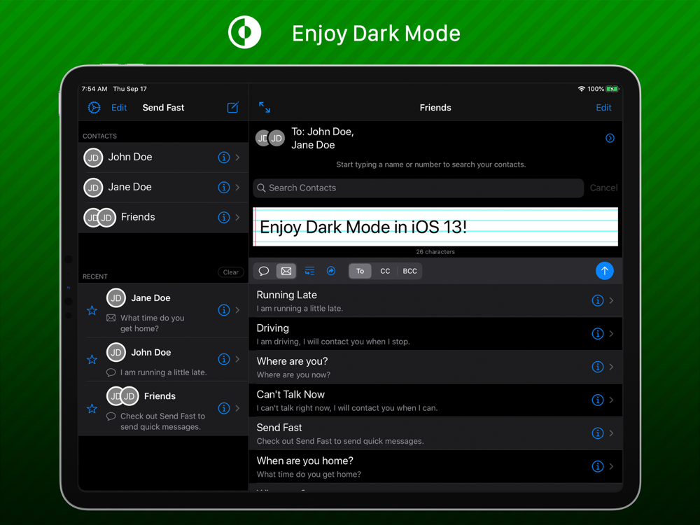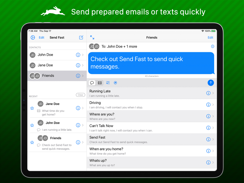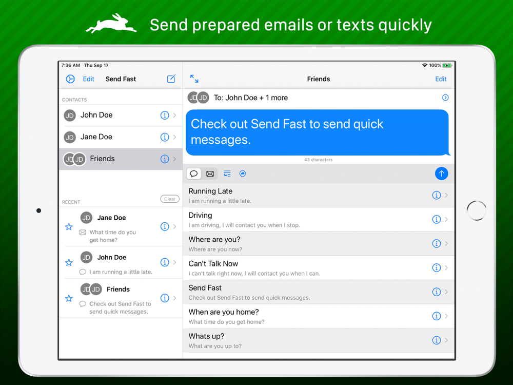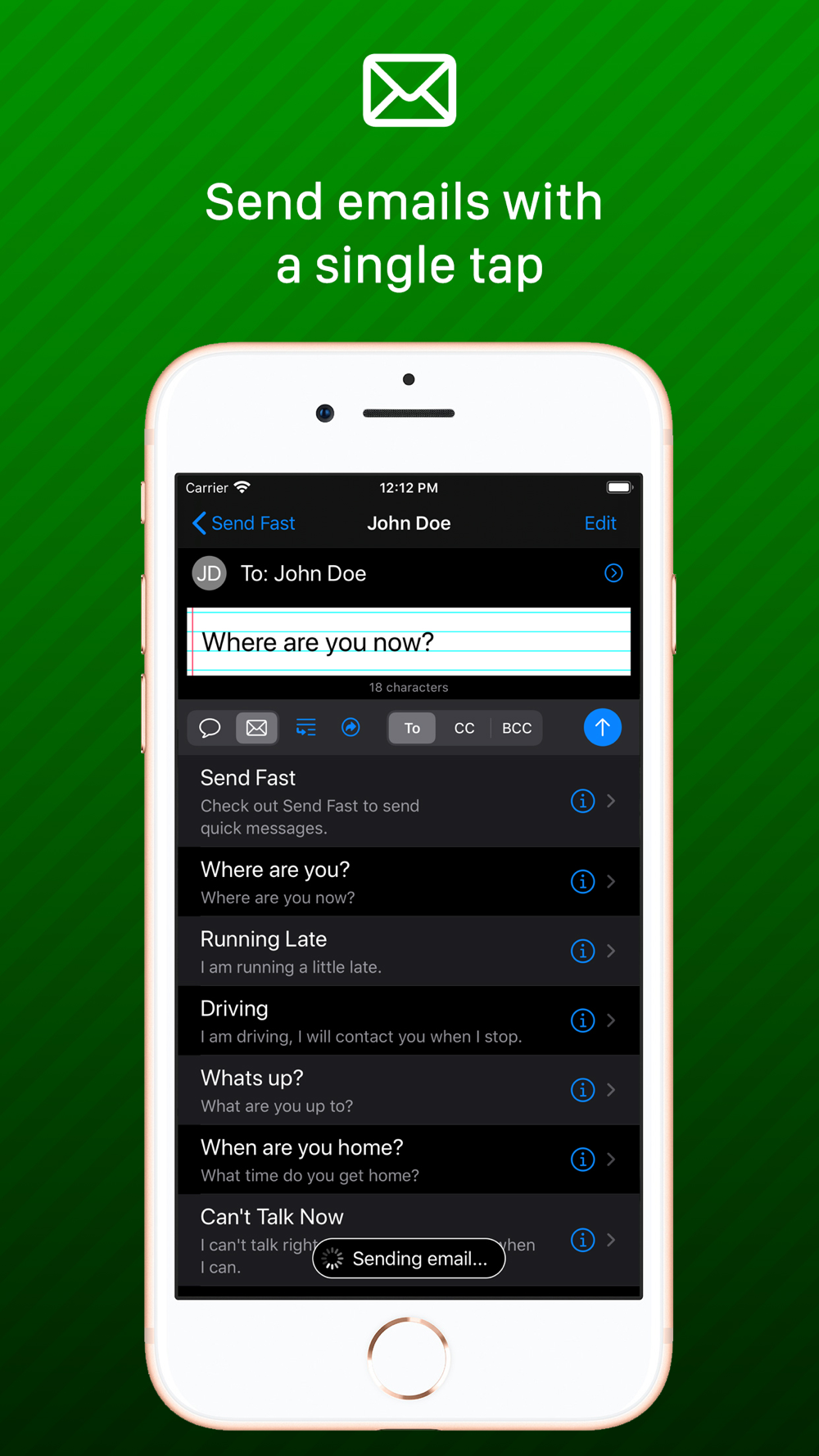 Send Fast is an easy to use text message and email composing assistant designed to make you more efficient in your messaging. Load pre-made phrases into a text message or email with one tap. Designed to behave similar to the built-in messaging systems to be easy to use. You can also send emails that will arrive as text messages!