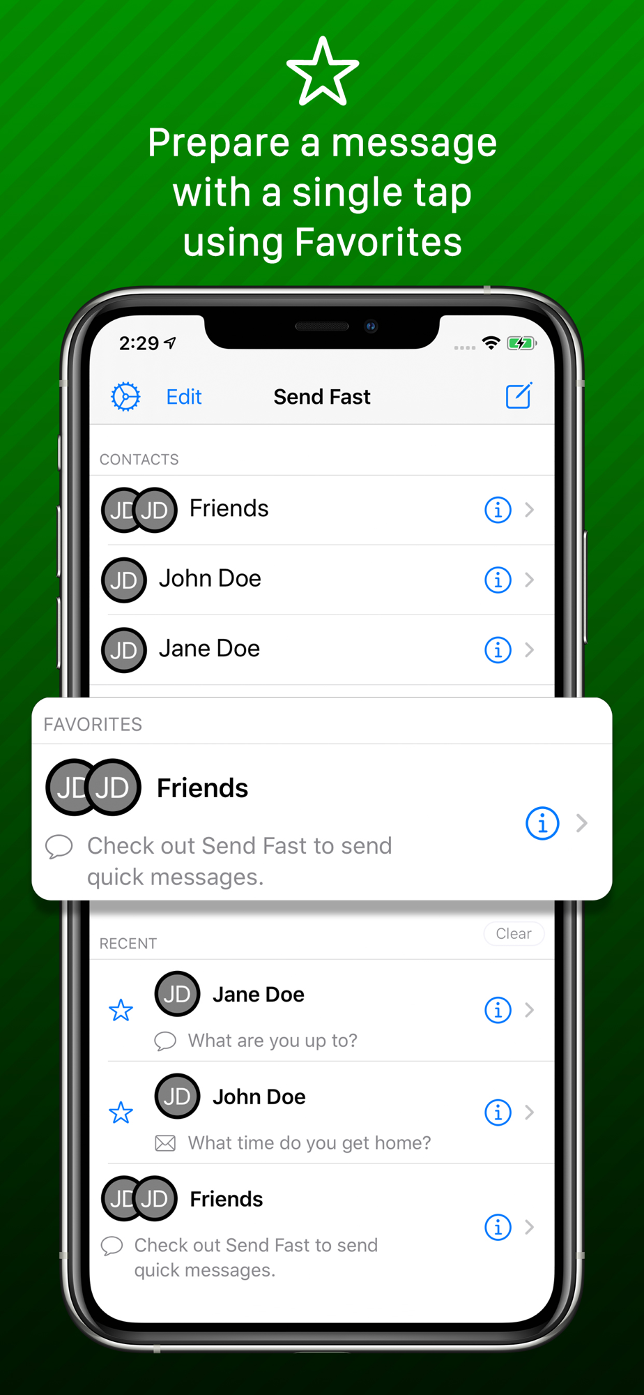 Add recent messages to a list of Favorites. Resend messages with just one or two taps.