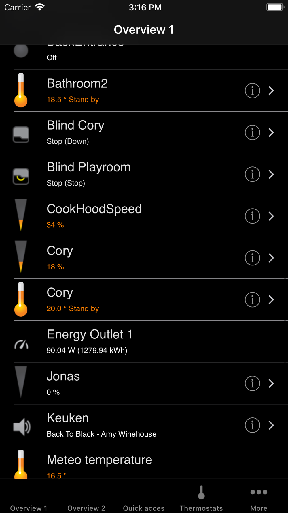 Home center for iPhone displays all available functions or 'channels' for your home automation system. The channels are organized in zones on tab pages. On an iPad these will automatically be presented in a layout identical to the layout created on the Windows and Web client for Home center.