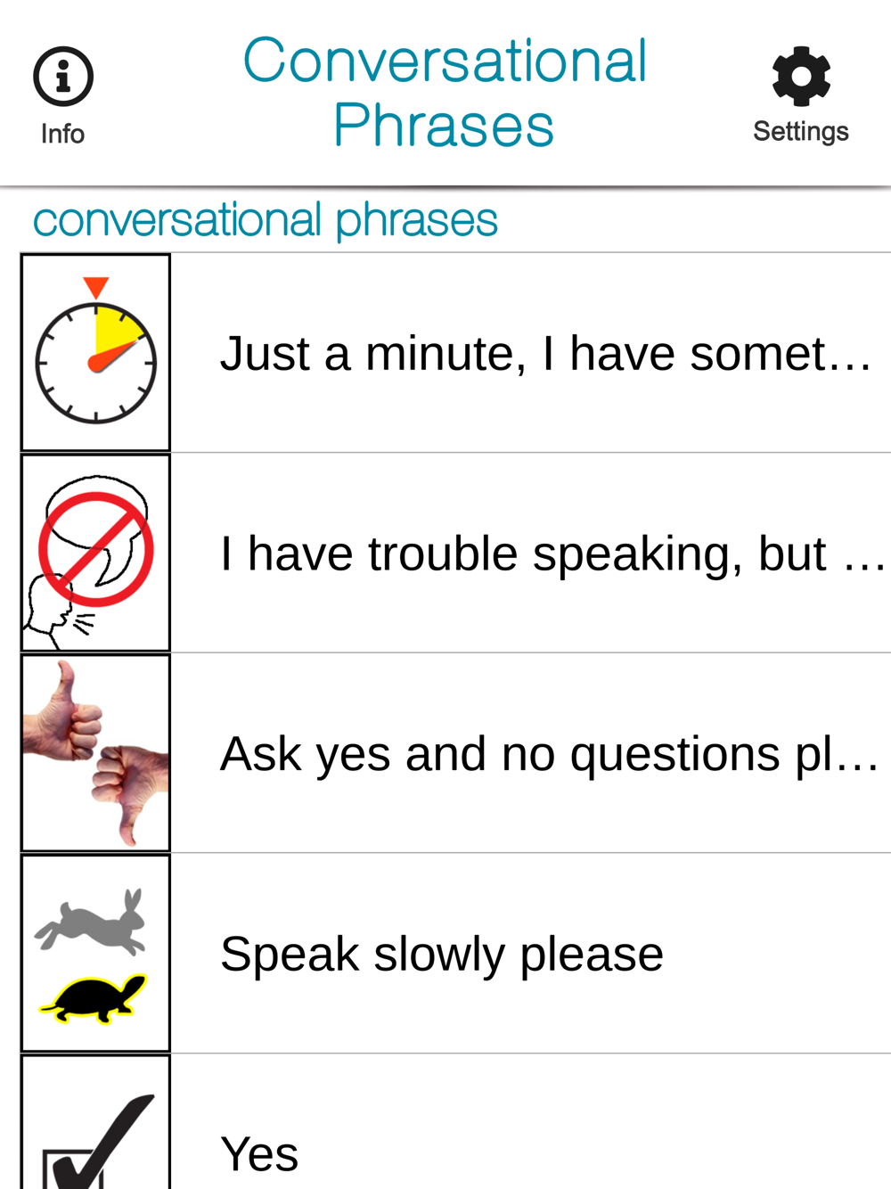 SmallTalk Conversational Phrases provides a library of pictures you can tap that speak out loud. This includes common words and phrases like greetings, responses, requests, and statements on well-being. It’s perfect for conversing with friends, relatives, and others.